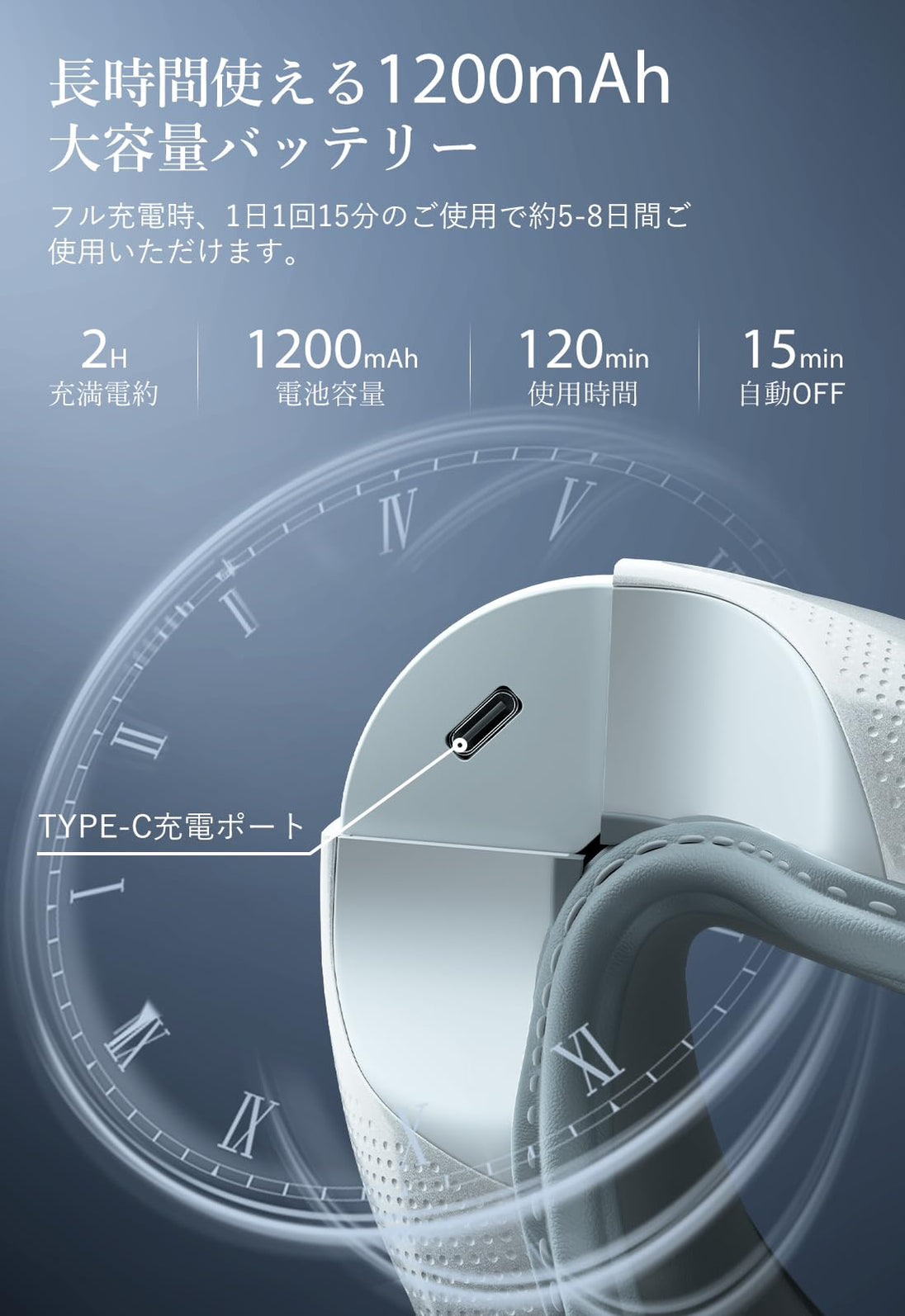 - 【TYPE-C急速充電&1200mAh大容量】 llanoのアイウォーマーはTYPE-C急速充電が可能で、車のシガーソケットやモバイルバッテリーからも充電できます。出張やオフィスで大活躍し、1200mAhの大容量バッテリーを搭載しており、フル充電で約8日間使用できます。【15分間自動オフ】15分間のタイマーが搭載されており、過剰利用を防止し、寝落ちしてしまってもあんし んです。