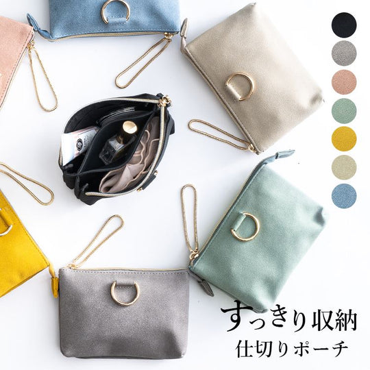 ポーチ おしゃれ 小物入れ 仕切り 三層 かわいい コンパクト 小さい ミニ リングモチーフ ファスナー マチあり 収納 機能的 整理整頓 収納 女性 レディース 仕事 学生 通勤 化粧ポーチ コスメポーチ 旅行 無地 スエード調 大人 ギフト プレゼント