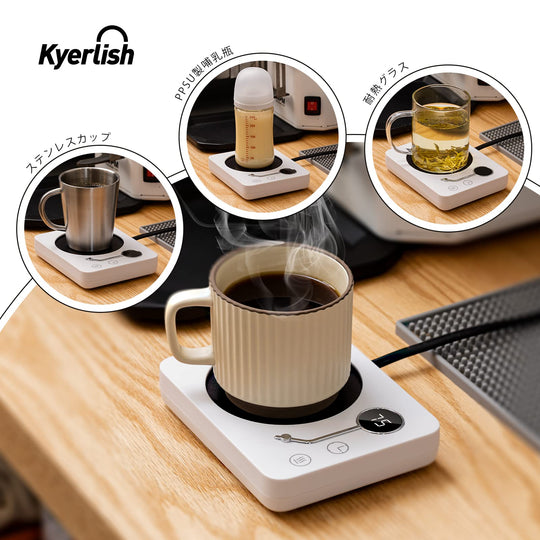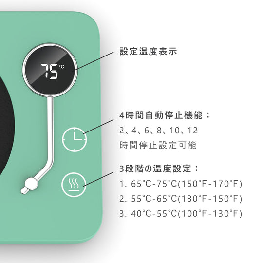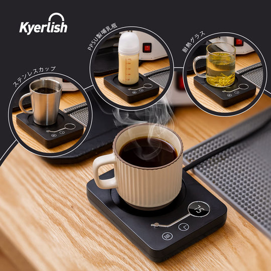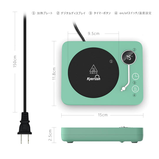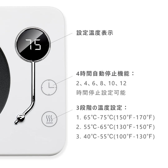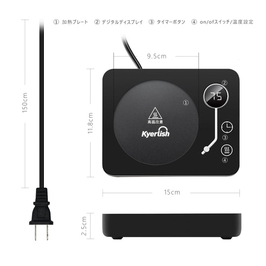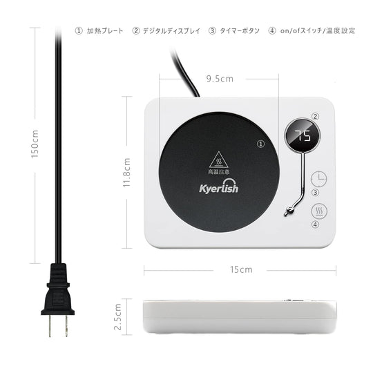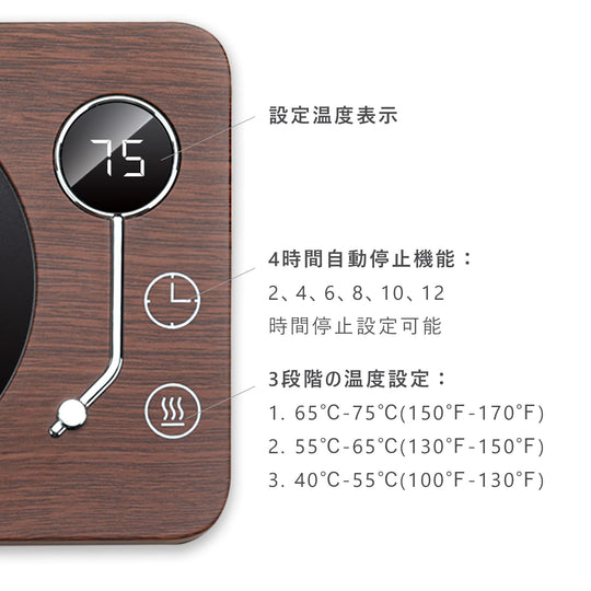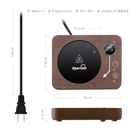 ご注意ください:カップは撮影用で、含まれていません。重力感知ボタンがあるため、200g以上のカップの使用を推奨します。また、製品が日本のPSE安全基準に適合させるために、電源コードは製品が実際に必要とするよりも太くなります。 【3段階の温度設定】カップウォーマーには3段階の温度設定があり、飲み物の温度を40℃-55℃、55℃-65℃、65℃-75℃に維持することができます。仕事、勉強、ゲームに夢中で飲み物の最適温度を見逃すことを防ぐ。定格消費電力:30W。1時間あたりの電気代は:約0.78円(1kWh単価26円で計算)。 【3つの付帯機能】◇自動電源オフ:安全を確保するために、4時間続けて使用すると自動的に電源が切れます。◇タイミング機能:加熱中にタイマーボタンを直接触ると、2、4、6、8、10、12時間を選択し、オフ時間を設定することが可能です。◇重力感知機能:カップウォーマーの底には重力感知ボタンがあり、十分な重量を感知しないと運転しません。運転中カップを外した後、10分間スタンバイモードに入り、10分以内にカップを戻さないと自動的に電源が切れます。 【適用のカップ】カップ底の直径9.5 cm以内のステンレスカップ、セラミックカップ、耐熱グラス、PPSU製哺乳瓶、箱入りミルクなどに適しています。実際のカップの材質やカップ底面の厚さによって具体的な保温温度は異なります。 【最適のギフト】カップウォーマーは飲み物を適切な温度に保つことができます。誕生日、バレンタインデー、感謝祭、クリスマス、母の日、その他の特別な日には、ご家族、ご恋人、お友達へのプレゼントに最適です。オフィスや自宅で使用し、温かい飲み物を楽しむことで、快適に過ごすことができます。 【保証期間 】お買い上げ日から1年間(日本語取扱説明書付き)。ご不明な点がございましたら、いつでもアマゾンでお問い合わせください。24時間以内に日本語で対応します。 › もっと見る 色 木目-75℃ 材質 アルミニウム, アクリロニトリルブタジエンスチレン (ABS) ブランド Kyerlish 商品の寸法 15長さ x 11.8幅 x 2.5高さ cm 電源 AC100V、50/60Hz全国対応តម្លៃដែលទៀងទាត់ 2,900តម្លៃដែលទៀងទាត់ 2,900 -