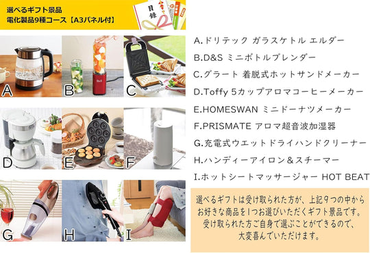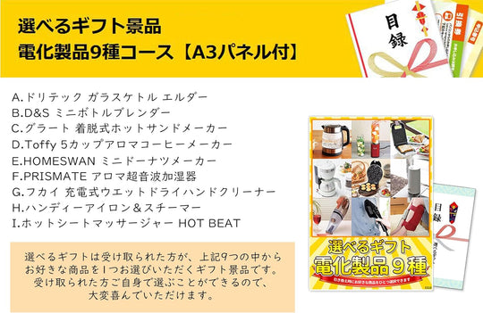 選べるギフト景品 電化製品9種コース【商品引換券】【A3パネル付】結婚式 ゴルフコンペ ビンゴ 忘年会 新年会