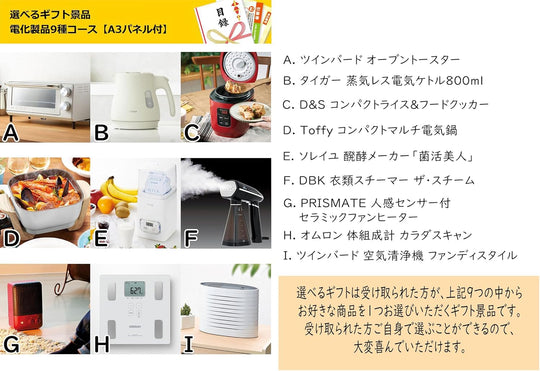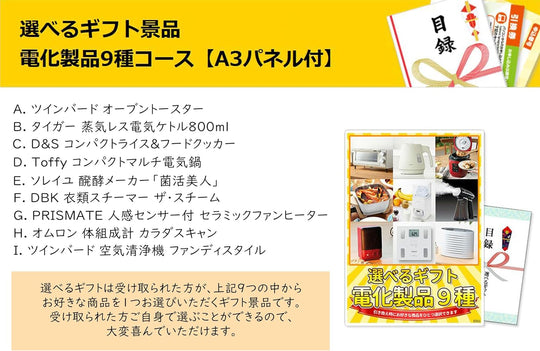 選べるギフト景品 電化製品9種コース【商品引換券】【A3パネル付】【M-E011】結婚式 ゴルフコンペ ビンゴ 忘年会 新年会