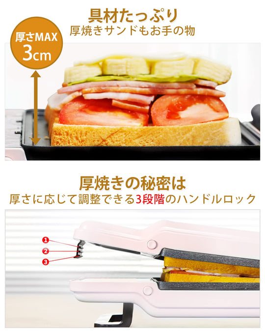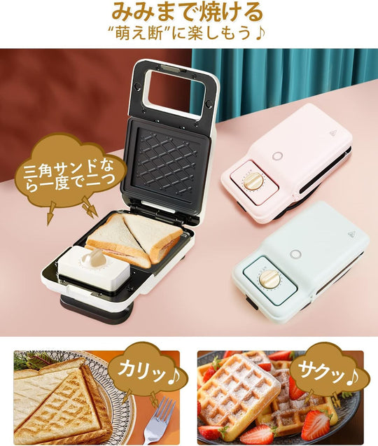 🥪【両面焼き・300秒で朝食を満喫】上下両面にヒーターを搭載しているので、600W高出力のハイパワーで、ムラなく全体に火を通すことが出来ます。空の状態で、本体を3分程度予熱したら前準備は完了。ホットサンドの焼き上げ時間は2分程。セットして待つだけで、美味しいホットサンド/ワッフルを楽しめます、忙しい朝でも焼きすぎる心配はございません、たった5分で美味しいホットサンドが完成します♪それに一度予熱した後、連続稼働で次々焼ける♪家族と一緒に楽しみましょう! 🥪【食パン耳まで美味しく・話題の萌え断】パンの耳が苦手で、わざわざ切り落としているでしょう?一度、「SOLEMOODホットサンドメーカー」で作ったホットサンドをお試しください!しっかりとプレスし、耳の部分もこんがりカリっと焼き上げるので、きっとあなたも食パンの耳が好きになります。最大3cmの厚さの、パンの耳までサクサクに焼き上げた美味しいい厚焼きサンドが作れます。(調理する食材の厚さは3cmを超えないようにご注意ください) 🥪【4枚プレート付き・一台多役】4枚プレート(サンドイッチ用×2、ワッフル用×2)が付属していて、サンドイッチ、ワッフル、焼肉、目玉焼きなど1台だけで作れます。本格ワッフルをタネから焼き上げたり、ちょい焼きグリルとしてお使いいただくことも可能です!なお、レシピが付属します。朝食、おやつ、デザート…毎日使いたくなる簡単レシピがいっぱい!たくさんの人気料理がたちまち完成できるんです! 🥪【取り外して洗い可能・収納便利】プレートは取り外して、中性洗剤で丸洗い頂けます。洗浄後はよく乾かしてから本体に設置してください。本体が汚れた場合は、柔らかい乾いた布で拭きとってください。コードはすっきり後ろに収納できます。実用性も抜群です。ご注意:プレートの着脱、本体の収納時など、必ず本体を完全に冷ましてから行ってください。 🥪【過熱保護・1年間安全保証】過熱保護機能も搭載。本体温度が240℃を超えると、自動的に過熱を一時停止。1-2分程経過後、本体の温度が240℃を下回ると、再度過熱を再開します。ご購入後1年間の保証期間を設けております。取扱説明書に従った使用状態での商品の不具合につきましては、当社送料負担の上、修理・交換対応をさせて頂きます。※故意の過失等で生じた不具合は除きます。ご注意:本製品のプレートは食器洗い機による洗濯は不可で、手洗いお勧めです。 › もっと見る 特徴 電気 色 ブルー 材質 アルミニウム ブランド SOLEMOOD 商品の寸法 24.9奥行き x 14.1幅 x 10高さ cm ワット数 600 W 商品の重量 1.4 キログラム 付属コンポーネント ワーフルプレート*2 スタイル 圧着式 電圧 100 ボルトតម្លៃដែលទៀងទាត់ ពី 0តម្លៃដែលទៀងទាត់ ពី 0 -