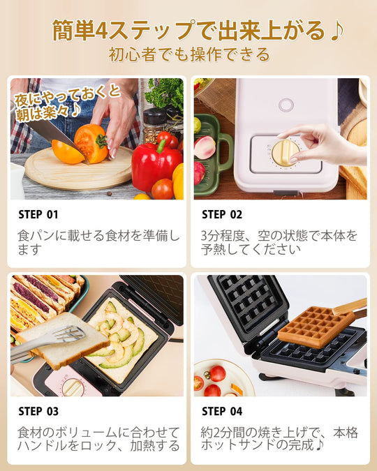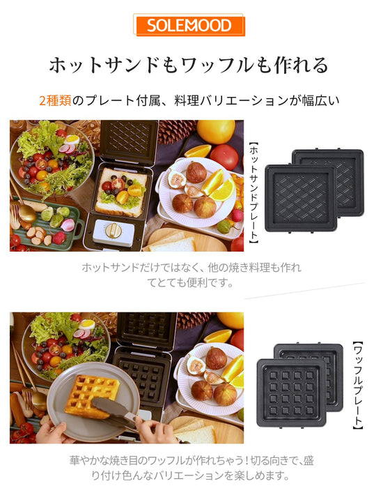 ホットサンドメーカー SOLEMOOD ワッフルメーカー 耳まで焼ける ホットサンドメーカー 電気 ワッフルメーカー 電気 圧着式 上下両面焼き ホットサンドメーカー大きめ 耳まで焼ける 4つのプレートが付属 わっふるめーかー 焼きグリルとして 朝食とランチ用に 家庭主婦/一人暮らしの方 簡単にお手入れ (グリーン)