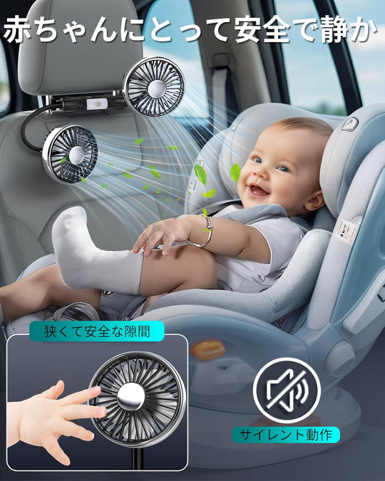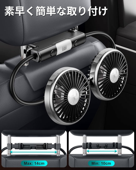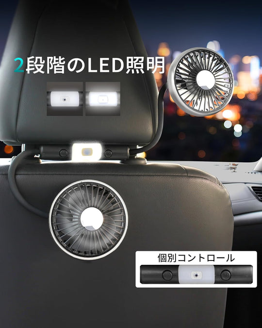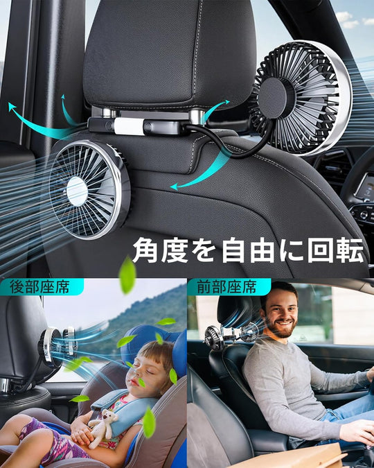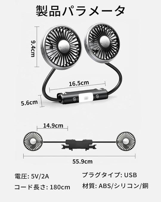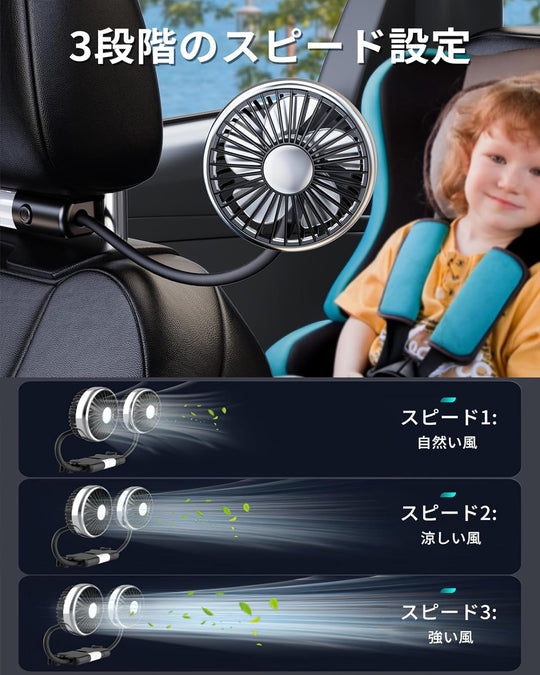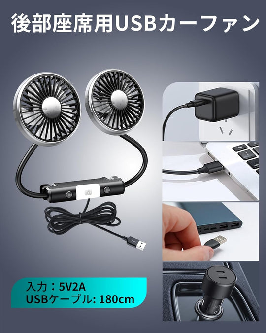 車扇風機 後部座席 usb ダブルホース360度自由回転 3段階風量 LED調光 静音設計 usb扇風機 車 赤ちゃん連れドライブも快適 全車種対応 180cm長ケーブル 3秒設置 夏の車内快適化マストアイテム [並行輸入品]