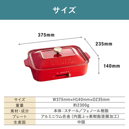ブルーノのコンパクトホットプレートは、小型でスタイリッシュなデザインで、ひとり暮らしや小さなキッチンにもぴったりです。1200Wのパワーと温度調節機能(65℃から250℃まで)で、多彩な料理を簡単に調理できます。プレートは取り替え式で、セラミックコート鍋やマルチプレート、グリルプレートなど、3種類を同梱しています。安全装置も搭載されており、洗浄も容易です。モダンなデザインで、 Mint Gray、緑、灰の3色から選べます。 [原産国]:中国製 機能:・コンパクトホットプレート:定格消費電力:1200W、プレート取り替え式、温度調節(65℃~250℃)、安全装置(サーモスタット/温度ヒューズ)、フッ素樹脂コート(プレート) ・セラミックコート鍋:内側表面セラミックコート ・マルチプレート、グリルプレート:内側表面フッ素樹脂コート › もっと見る 色 ミントグレー ブランド BRUNO ワット数 1200 W 付属コンポーネント プレート、ふた 電圧 100 ボルト 設定数 1 メーカー BRUNOតម្លៃដែលទៀងទាត់ ពី 11,000តម្លៃដែលទៀងទាត់ ពី 11,000 -