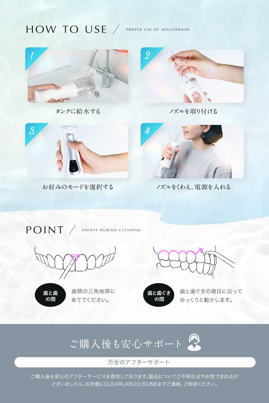✅【現役歯科医師監修】CLEARLABO(クリアラボ)ORAL IRRIGATOR。普段の歯磨きだけでは落としきれない食べかすや歯垢汚れを、ジェット水流で徹底洗浄。磨き残しを減らすことで、虫歯や歯周病・口臭の予防に期待ができます。老若男女どんな方でも歯間や歯周ポケットに水を当てて動かすだけで、わずか2分間で口腔内をキレイに洗浄できます。【重さ】約280g【大きさ】8cm×8cm×23㎝(本体サイズ) ✅【1台2役、2種のノズル】標準ノズルと先端にブラシが付いた矯正用ノズルの2種を採用。歯間や歯周ポケットのプラーク(歯垢)にアプローチ。歯列矯正器具の詰まりや汚れが気になる方にもおすすめです。【360度回転ノズル】ノズルを当てるだけで、奥歯や歯の裏など、普段歯磨きでは届きにくいところも簡単にキレイに。歯や歯ぐきにやさしく歯垢が除去できます。 ✅【300ml水タンク】何度も給水しなくても使える大容量の水タンク。取り外し可能で、お手入れも簡単です。【IPX7防水機能付き】洗面台では水の飛び散りが気になる、そんな方でも安心して入浴中にもご使用いただけます。もちろん、丸ごと水洗いも可能です。※充電口のカバーを完全に装着してください。【最大25日間使用可能】大容量2,000mAhのリチウムイオンバッテリーを搭載。1度の充電で最大約25日間使用可能です(※約6時間充電、1日2回、計4分で使用した場合)。 ✅【見やすい液晶画面付き&簡単操作】1.水タンクに給水します。2.ノズルを本体に取り付けます。3.モード切替ボタンを短く押し、お好みのモードを選びます。4.ノズルをくわえ、電源を入れます。5.歯間や歯周ポケットを狙って水を当てます。※2分後に自動的に停止します。【4つのモード】その日の気分やケアしたい内容によって、水圧の強さや動きが異なる4つのモードからお好みのモードをお選びいただけます。メモリー機能が付いており、いつでもお気に入りのモードから始められます。水圧が弱いモードの設定もございますので、口腔洗浄器の使用が初めての方にもおすすめです。 ✅【日本企画安心サポート】製品についてご不明な点やお気づきの点がございましたら、弊社カスタマーサポートにお気軽にご連絡、ご相談ください。【付属品】本体、ノズル2種、充電用USBコード、日本語取扱説明書(保証書付き)※ノズルの交換目安は3ヵ月ごとです。※CLEARLABO専用品以外のノズルは使用できません。※ACアダプターの同梱はございません。別途ご用意ください。※定格電源DC5V-1A超の出力で充電された場合、充電できない、うまく作動しない場合がございますので充電の際は定格電源DC5V-1Aのものをご使用ください。※スマートフォンなどの急速充電は出力が強すぎる場合があるため使用しないでください。※初めての充電時や長期間使用しなかった場合、充電時間や使用時間が目安と大きく異なる場合がありますが、通常何度か充電や使用を繰り返すと正常に戻ります。 ✅【使用上の注意】※いきなり水圧の強いモードを使用すると、出血する可能性がございます。はじめてお使いいただく際や長期間使用していなかった場合は、必ず「Sensitiveモード」をご使用頂き、慣れてから別のモードを使用してください。※歯や歯ぐきにノズルを強く押し当てたり、1か所にとどまらせて当て続けたりしないでください、歯や歯ぐきを傷つける恐れがあります。※ペースメーカー、人口心肺、心電計を使用している方は本製品を使用しないでください。※充電口が水に濡れた状態で充電をしないでください。 › もっと見る ブランド CLEARLABO 電源 バッテリー式 特徴 複数の動作モード 商品特長 歯垢 ユニット数 1.00 個តម្លៃដែលទៀងទាត់ ពី 1,500តម្លៃដែលទៀងទាត់ ពី 1,500 -
