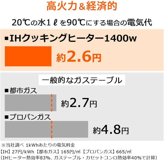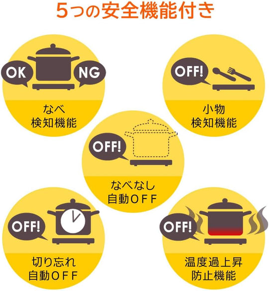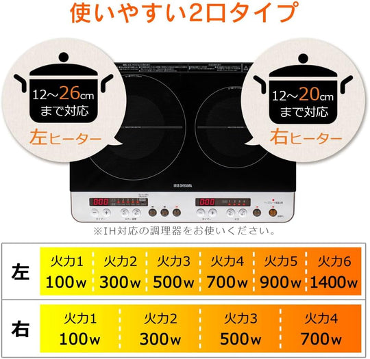 2口タイプのIHクッキングヒーターです。電気工事なしですぐに使え、便利な脚付きタイプ。最大火力1400Wで炒め物から揚げ物まで幅広い料理に対応しています。 タイマー:1分~9時間50分。使用可能ななべの大きさ:直径12~26cm(左ヒーター)、直径12~20cm(右ヒーター) 安全機能:なべ検知機能、なべなし自動OFF、小物検知機能、切り忘れ自動OFF、温度過上昇防止機能 使える鍋の材質:鉄、鉄鋳物、耐熱ホーロー、ステンレス(18-0、18-8、18-10)、多層鋼なべ コード長:約1.6m 右ヒーターを使用中は、左ヒーターはハイパワーでは調理できません。左右のヒーターを同時に使う場合は、総消費電力を超えないようヒーターの火力を調整することがあります。揚げ物調理中は、右ヒーターでは調理できません。 商品サイズ(cm):幅約56×奥行約40×高さ約18 材質:【本体】ポリアミド樹脂、【トッププレート】結晶化ガラス 電源:AC100V(50/60Hz共用) 消費電力:1400W 製品仕様:【火力調整】〈左ヒーター>加熱調理:6段階(約100W相当から約1400W)、揚げ物調理:6段階(150~200℃)〈右ヒーター〉加熱調理:4段階(約100W相当から約700W) 【コードの長さ】約1.6m 【タイマー】1分から9時間50分 使えるなべ:【材質】鉄・鉄鋳物、耐熱ほうろう、ステンレス、多層鋼なべ【大きさ】〈左ヒーター〉直径12から26cmのもの※湯わかしの場合は直径15から23cm、〈右ヒーター〉直径12から20cmのもの【形状】底の平らなもの、反りが3mm以下のもの 使えないなべ:【材質】耐熱ガラス、陶磁器・土なべ、アルミ・銅 【大きさ】直径12cm未満のもの、トッププレートからはみ出すサイズのもの 【形状】中華なべなど底が丸いもの、底に段がありトッププレートに密着しないもの、脚があるもの※IH調理器では、材質や大きさにより使える鍋と使えない鍋があります。使用する鍋は、財団法人「製品安全協会」のSGマークのあるものをお勧めします。 本体重量(kg):5.8、ヒーター数:2口、設置タイプ:卓上 › もっと見る 色 ブラック 材質 樹脂 特徴 タイマー ブランド アイリスオーヤマ(IRIS OHYAMA) 加熱要素 2 商品の寸法 40奥行き x 56幅 x...តម្លៃដែលទៀងទាត់ 11,742តម្លៃដែលទៀងទាត់ 11,742 -