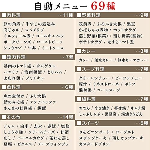 - 【自動メニュー69種】ネット販売限定モデルのみ搭載の自動メニューもあり、バラエティ豊かな食事がボタン一つで簡単にできます。また、自動メニューと連動したレシピブックも付属。レシピサイト用の二次元バーコードからスマホ、タブレットでも簡単にレシピを見ることができます。