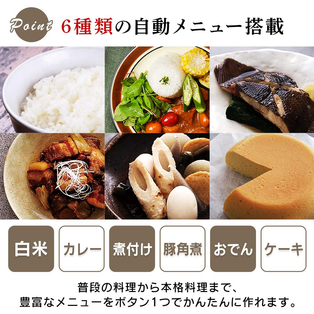 - 【ボタンを押すだけ3STEP】1.料理を選択 2.材料を入れてボタンを押す 3.あとは待つだけ!火を使わないので目を離していても安全。待っている間に他の調理や家事もできます。