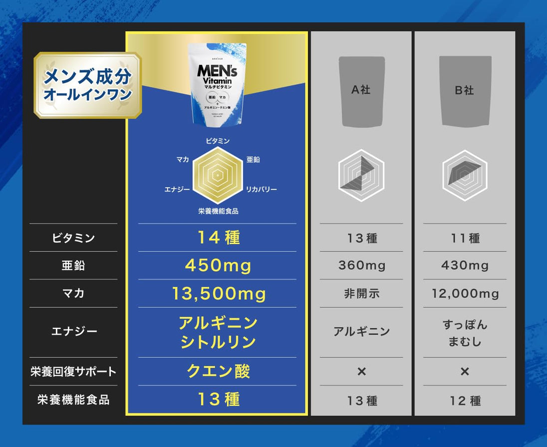 • 💪【メンズのためのマルチビタミン】 亜鉛・マカ・クエン酸・アルギニンを配合した錠剤型マルチビタミン(30回分/袋)