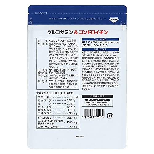 (Nutritional Facts) (per 6 capsules) Glucosamine 1200 mg, Chondroitin shark cartilage extract, 20% powder, 240 mg, Collagen peptide, 72 mg, Calcium 30 mg.