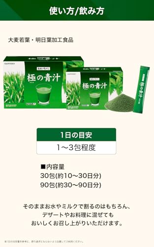- 【おすすめする理由3】生命力がみなぎる屋久島など国産の明日葉!「今日芽を摘んでも、また明日には芽を出す」といわれるほど生命力が強く、健康野菜として知られている明日葉。サントリーは、その明日葉の中でも茎が太く、葉が厚く、ビタミンEが豊富に含まれた屋久島など国産の明日葉を厳選して使用しました。