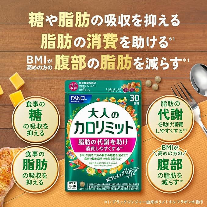 • 【代謝も気になる大人をサポート!】代謝も気になる大人をサポートする機能性表示食品。食事の糖や脂肪の吸収を抑える食事サポート成分(桑の葉イミノシュガー・茶花サポニン・キトサン)に加え、脂肪の代謝を助け消費しやすくし、腹部の脂肪を減らす機能が報告されている脂肪消費成分(ブラックジンジャー由来ポリメトキシフラボン)を配合。1回3粒を続けることでしっかりケアできます。