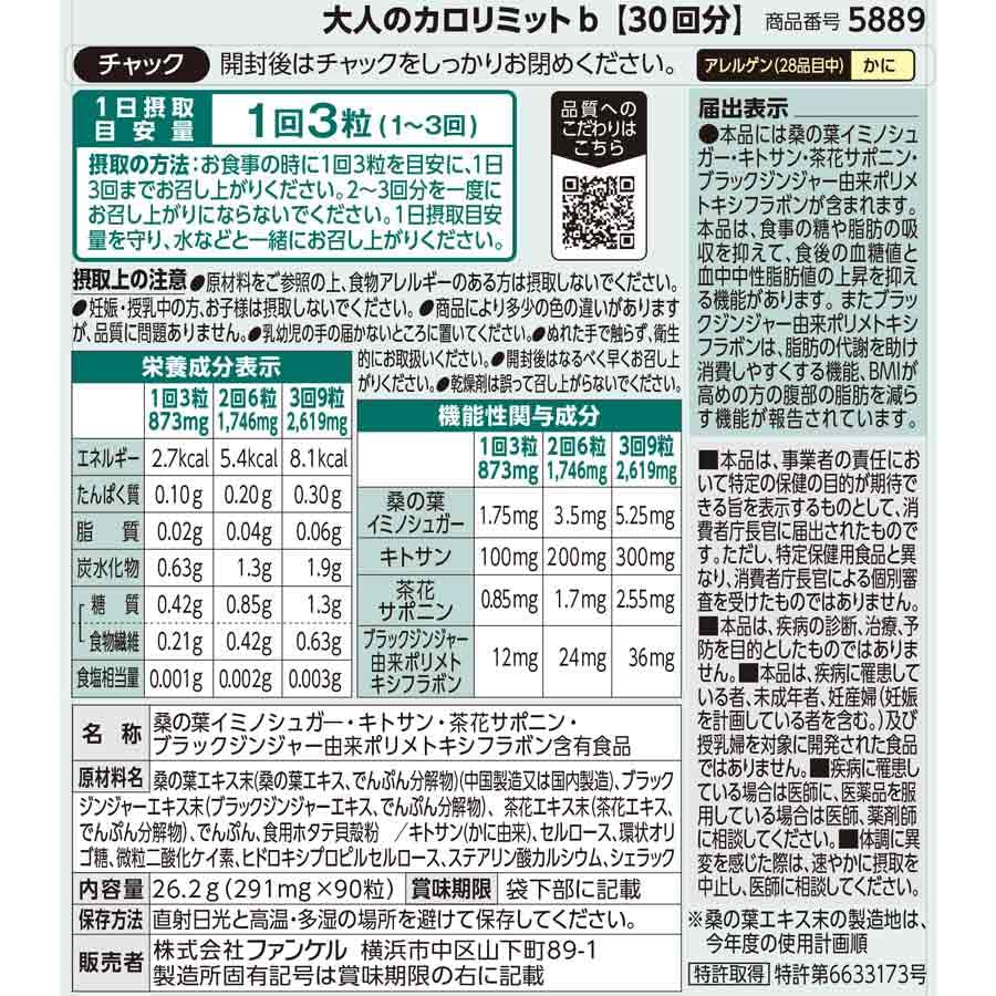• 【1回の目安】 3粒(1日1~3回) 【機能性関与成分/1回3粒当たり】 桑の葉イミノシュガー:1.75mg、キトサン:100mg、茶花サポニン:0.85mg、ブラックジンジャー由来ポリメトキシフラボン:12mg 【機能性表示食品についてのご注意】 ※本品は、特定保健用食品と異なり、消費者庁長官による個別審査を受けたものではありません。 ※疾病の診断、治療、予防を目的としたものではありません。 ※食生活は、主食、主菜、副菜を基本に、食事のバランスを。【アレルギー物質】 かに 【ご注意】 ※妊娠・授乳中の方、お子様はお召し上がりにならないでください。