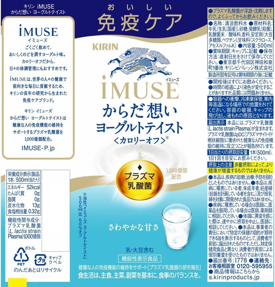 プラズマ乳酸菌 キリン iMUSE(イミューズ) からだ想い ヨーグルトテイスト 500ml 24本 免疫ケア 乳酸菌 機能性表示食品 ペットボトル ヨーグルトテイスト 低カロリー