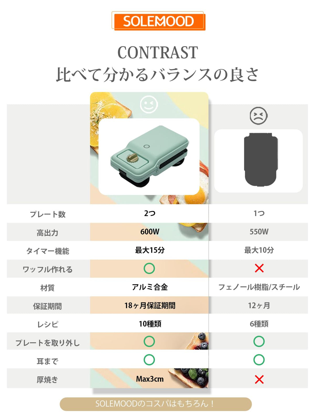 • 🥪【食パン耳まで美味しく・話題の萌え断】パンの耳が苦手で、わざわざ切り落としているでしょう?一度、「SOLEMOODホットサンドメーカー」で作ったホットサンドをお試しください!しっかりとプレスし、耳の部分もこんがりカリっと焼き上げるので、きっとあなたも食パンの耳が好きになります。最大3cmの厚さの、パンの耳までサクサクに焼き上げた美味しいい厚焼きサンドが作れます。(調理する食材の厚さは3cmを超えないようにご注意ください)
