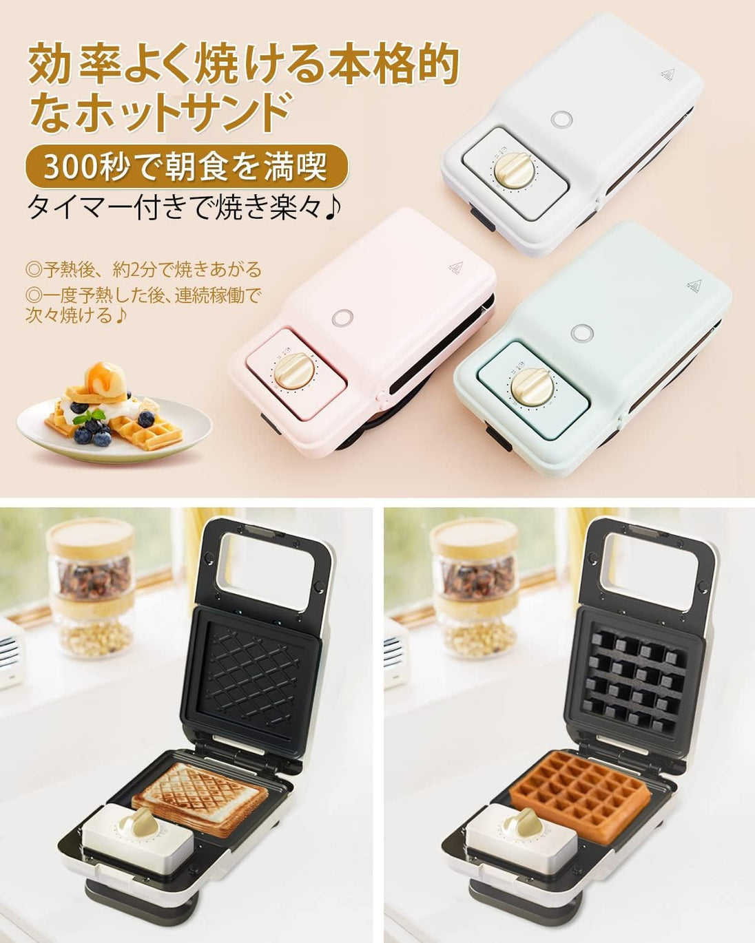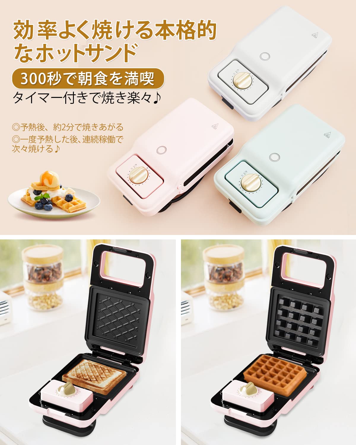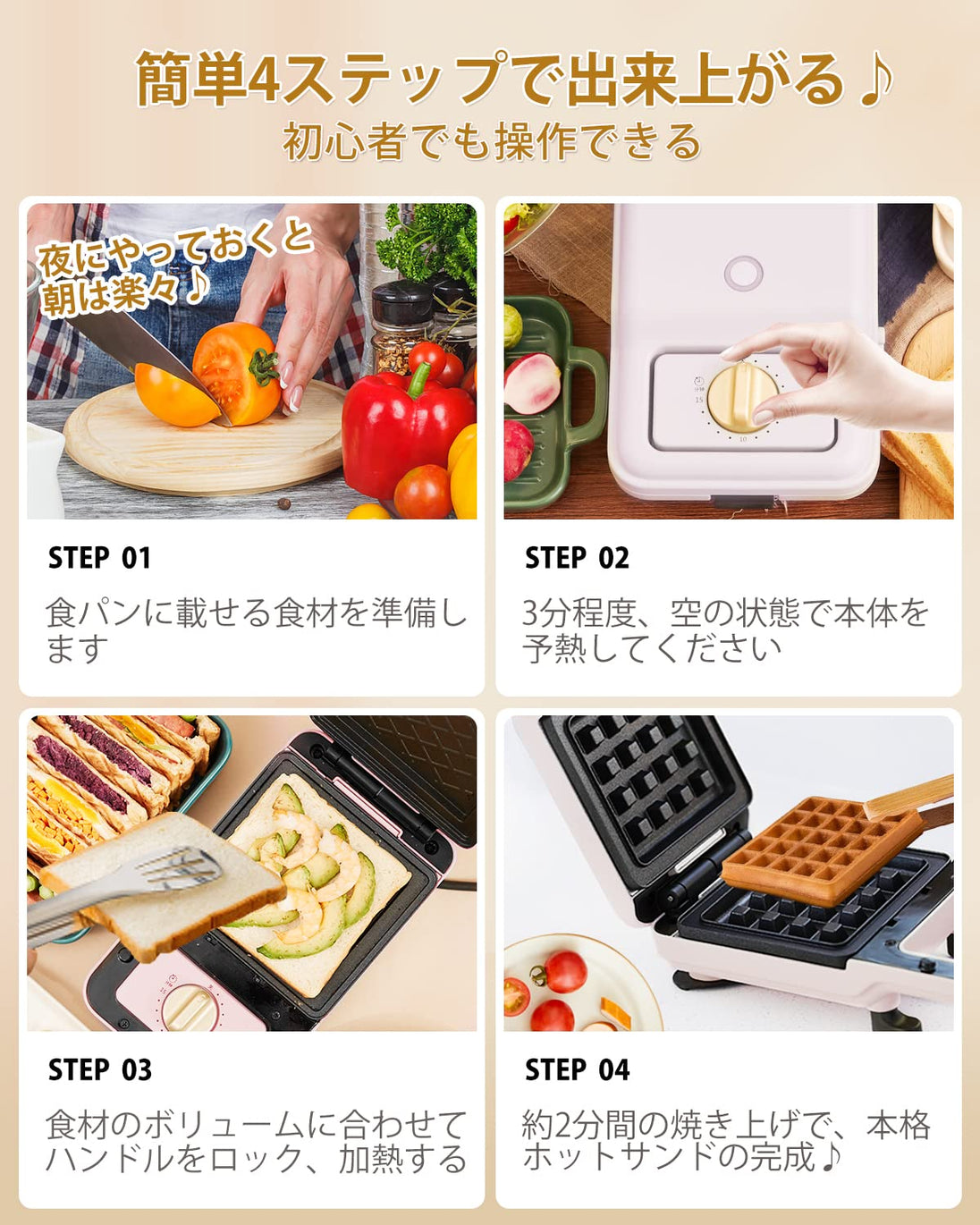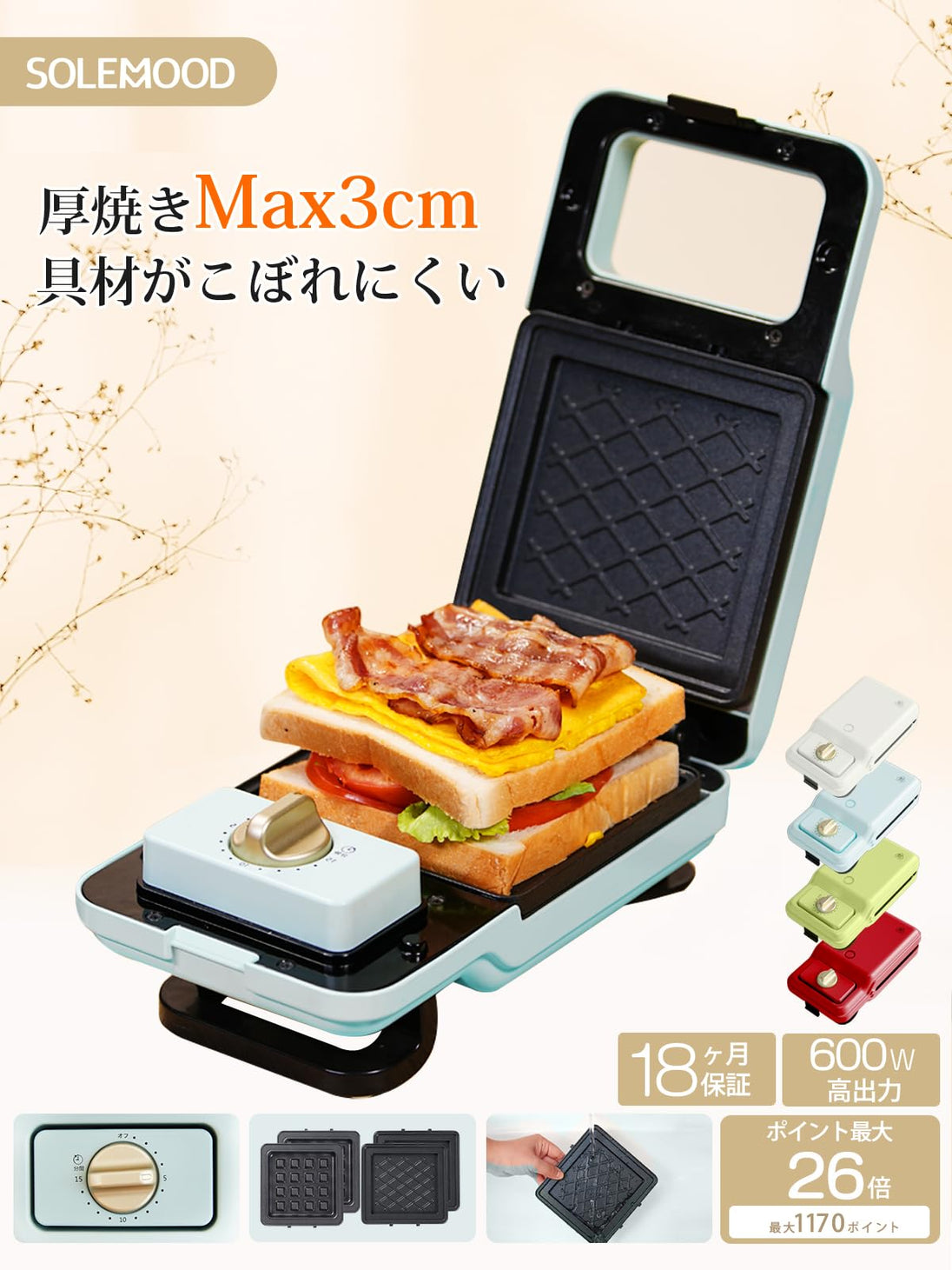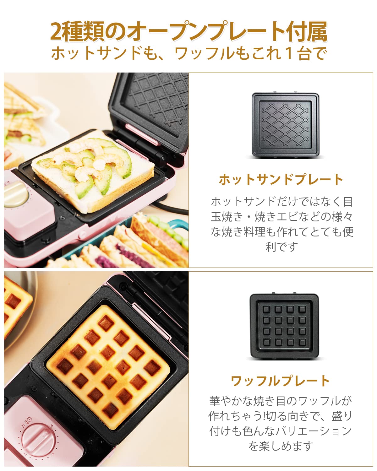 • 🥪【4枚プレート付き・一台多役】4枚プレート(サンドイッチ用×2、ワッフル用×2)が付属していて、サンドイッチ、ワッフル、焼肉、目玉焼きなど1台だけで作れます。本格ワッフルをタネから焼き上げたり、ちょい焼きグリルとしてお使いいただくことも可能です!なお、レシピが付属します。朝食、おやつ、デザート…毎日使いたくなる簡単レシピがいっぱい!たくさんの人気料理がたちまち完成できるんです!
