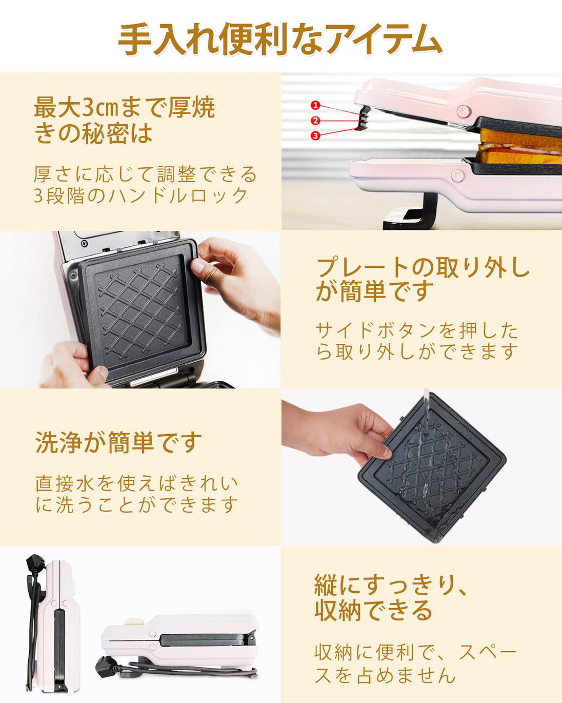 • 🥪【取り外して洗い可能・収納便利】プレートは取り外して、中性洗剤で丸洗い頂けます。洗浄後はよく乾かしてから本体に設置してください。本体が汚れた場合は、柔らかい乾いた布で拭きとってください。コードはすっきり後ろに収納できます。実用性も抜群です。ご注意:プレートの着脱、本体の収納時など、必ず本体を完全に冷ましてから行ってください。