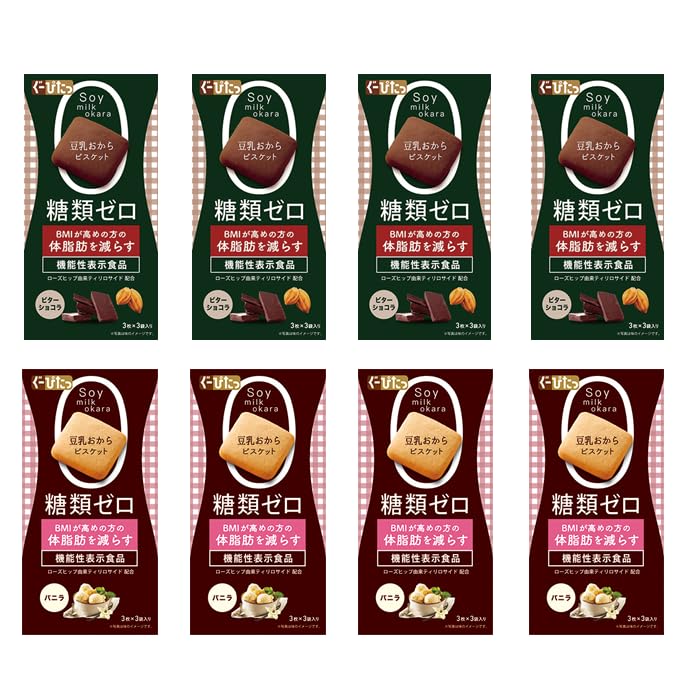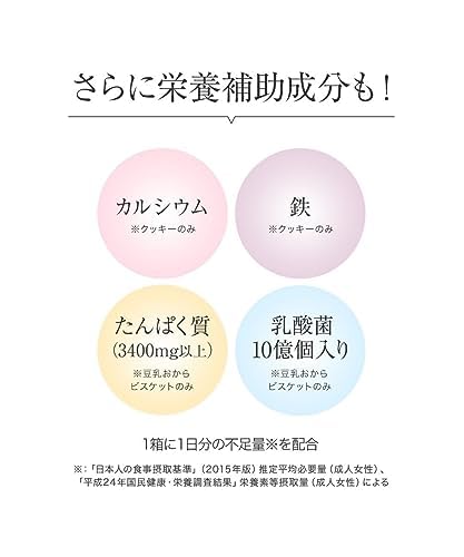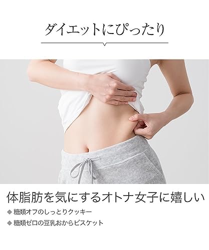 - 【日本初!※1 BMIが高めの方※2の体脂肪を減らす機能性表示食品ビスケット】日本初!※1 51kcal台(1袋/3枚)・砂糖ゼロ・糖類ゼロ・食物繊維配合の機能性表示食品。豆乳とおからを練りこんだやさしい甘さのビスケットです。自宅/オフィスのストック用や、毎日の食事ルーティンにもオススメ!