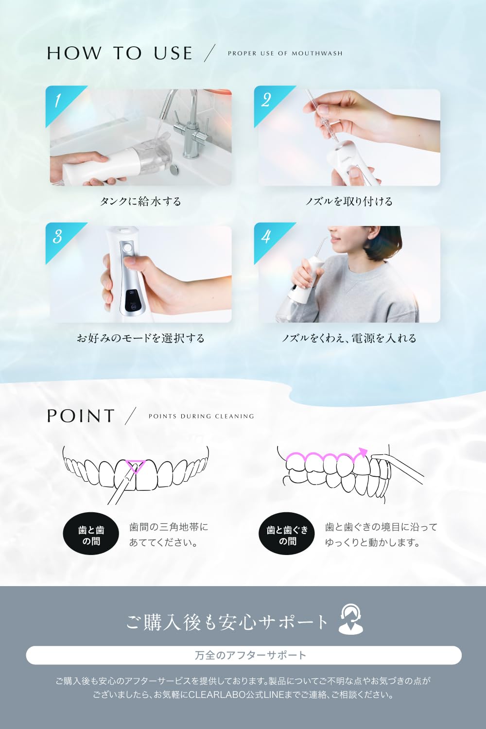 - ✅【現役歯科医師監修】CLEARLABO(クリアラボ)ORAL IRRIGATOR。普段の歯磨きだけでは落としきれない食べかすや歯垢汚れを、ジェット水流で徹底洗浄。磨き残しを減らすことで、虫歯や歯周病・口臭の予防に期待ができます。老若男女どんな方でも歯間や歯周ポケットに水を当てて動かすだけで、わずか2分間で口腔内をキレイに洗浄できます。【重さ】約280g【大きさ】8cm×8cm×23㎝(本体サイズ)