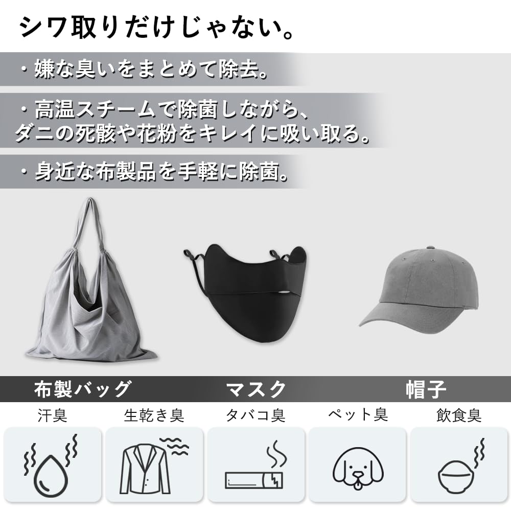 • 【片手で操作】アイロンがけの際、従来の衣類スチーマーのように衣類を引っ張る必要がないため、片手で操作可能で、火傷しにくい。