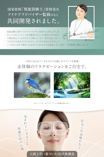 • (Overseen by Eye Care Advisor, Authentic Eye Spa RELX EYEWARMER) Comfortable heat setting at approximately 104°F (41°C). Refreshes your hard-working eyes by warming it gently The air pressure and vibrations reproduce the movement of the fingertips of the esthetician gently wraps around the eyes and temples. Recommended for those who use their smartphone or computer for a long time, or those who want to focus on their study or work at your desk