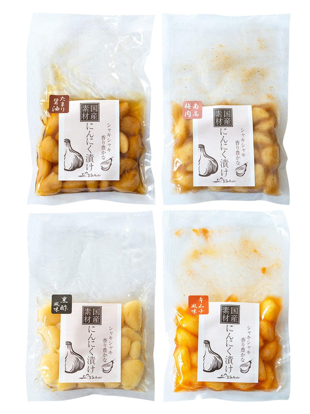 国産 にんにく 漬け 80gx4袋 詰め合わせセット (たまり醤油 南高梅肉 黒酢 キムチ) おかず 常温保存 大蒜 漬物 保存料不使用 健康志向 食品 料理 調味料 ご飯 つまみ プレゼント プチギフト 仕送り