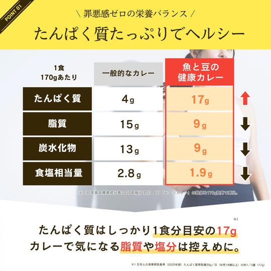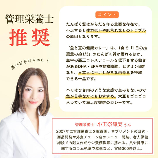 商品の説明 【管理栄養士推奨】1食分のたんぱく質をはじめ、必須脂肪酸DHA・EPA、イソフラボン、食物繊維、コラーゲン、ビタミンミネラル各種など、カラダづくり・健康づくりに役立つ栄養素を美味しく、手軽に摂れる「魚と豆の健康カレー」。健康と美容を維持したい方や、カラダにいいものを美味しく食べたい方に、ぜひお試しいただきたいカレーです。 原材料・成分 鱧、大豆 一皿で1食分のたんぱく質が摂れるほか、一般的なカレーと比較して、脂質と炭水化物を30%カット、食塩相当量を35%カット。 魚 × 大豆のWたんぱく。特徴の異なる2種類のたんぱく質を摂ることで、あなたのカラダづくり・健康づくりを効率的にサポートします。 たんぱく質のほかにも、必須脂肪酸であるDHAやEPA、カルシウム、食物繊維、コラーゲン、イソフラボン、ビタミンD、ビタミンEなど、魚と大豆ならではの多くの健康美容成分を一皿で摂ることが可能。 お子さまからご年配の方まで食べやすいよう辛さをおさえ、素材の味を大切にしたカレー。 レトルトなので、楽チン調理・長期保存可。 › もっと見る ブランド UOKIN LABO 商品の個数 4 サイズ 2個 ユニット数 1 個 メーカー UOKIN LABOGiá thông thường Từ 0Giá thông thường Từ 0 -