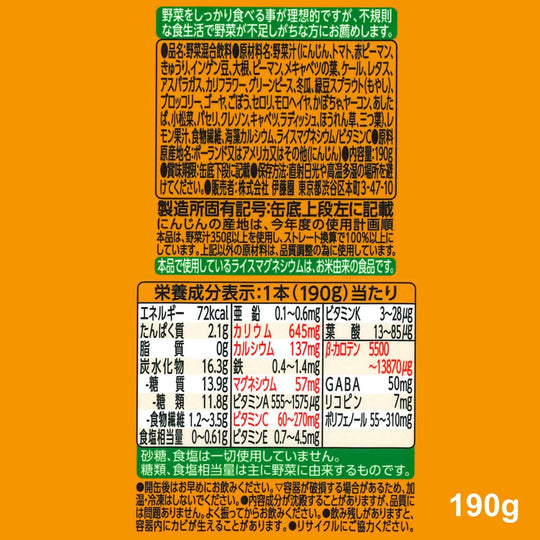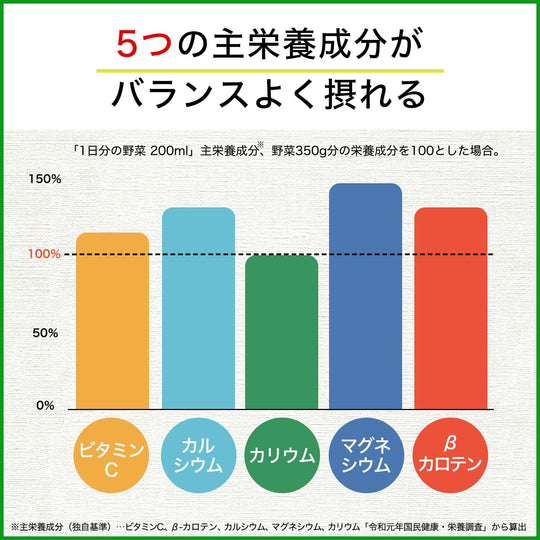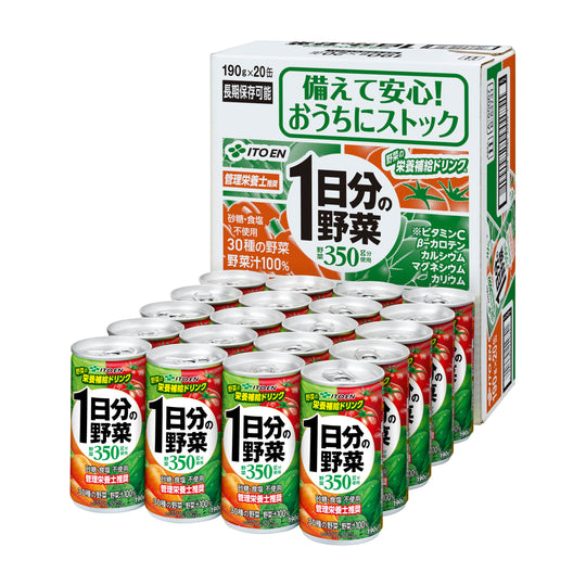 商品紹介 1日1本! 30日分ボックス。管理栄養士推奨、野菜と栄養がきっちり補える野菜100%飲料です。 ●厚生労働省が推奨する、1日の野菜摂取目標量350g分を使用しています。 ●野菜350g分の5つの主栄養成分(※1)をきっちり担保し、さらに日本人が1日に不足している主栄養成分(※2)も補えます。 ●野菜の主栄養成分に加え、GABA、リコピン、ポリフェノールも摂れます。 ●野菜本来のおいしさを大切に、砂糖、食塩は一切使用していません。 ●伊藤園のこだわり契約栽培「にんじん」を主体に30種類の野菜を使用しています。毎日飲み続けられる味わいです。 ●未開封の場合は常温で保管できます。開封後はお早めにお飲みください。 ●紙パックの野菜ジュースをお探しの方におすすめです。 (※1)主栄養成分(独自基準)…ビタミンC、β‐カロテン、カルシウム、マグネシウム、カリウム 「令和元年国民健康・栄養調査」より算出。 (※2)1日の栄養不足量…ビタミンC 6.5mg、β-カロテン 2,830μg、カルシウム 175mg、マグネシウム 73mg、カリウム 501mg 「令和元年国民健康・栄養調査」、「栄養素等表示基準値」より算出。 原材料・成分 原材料:野菜汁(にんじん、トマト、赤ピーマン、きゅうり、インゲン豆、大根、ピーマン、メキャベツの葉、ケール、レタス、アスパラガス、カリフラワー、グリーンピース、冬瓜、緑豆スプラウト(もやし)、ブロッコリー、ゴーヤ、ごぼう、セロリ、モロヘイヤ、かぼちゃ、ヤーコン、あしたば、小松菜、パセリ、クレソン、キャベツ、ラディッシュ、ほうれん草、三つ葉)、レモン果汁、食物繊維、海藻カルシウム、ライスマグネシウム/ビタミンC 原料原産地:ポーランド又はアメリカ又はその他(にんじん) ●原材料: 野菜汁(にんじん、トマト、赤ピーマン、きゅうり、インゲン豆、大根、ピーマン、メキャベツの葉、ケール、レタス、アスパラガス、カリフラワー、グリーンピース、冬瓜、緑豆スプラウト(もやし)、ブロッコリー、ゴーヤ、ごぼう、セロリ、モロヘイヤ、かぼちゃ、ヤーコン、あしたば、小松菜、パセリ、クレソン、キャベツ、ラディッシュ、ほうれん草、三つ葉)、レモン果汁、海藻カルシウム、ライスマグネシウム/ビタミンC ●カロリー:1本(200ml)当たり、73kcal ●栄養成分(1本(200ml)当たり):エネルギー 73kcal、たんぱく質 2.3g、脂質 0g、炭水化物 16.0g (糖質 14.5g、-糖類 10.8g、食物繊維 0.7~3.0g)、食塩相当量 0~0.62g、亜鉛 0.1~0.8mg、カリウム...Giá thông thường Từ 1,900Giá thông thường Từ 1,900 -