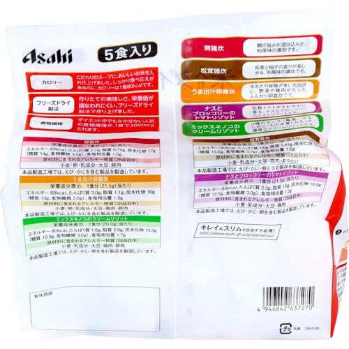 商品紹介 ・5食入り(鯛雑炊・松茸雑炊・うま出汁卵雑炊・ナスとブロッコリーのトマトリゾット・ミックスキノコのクリームリゾット(各1食)) ※商品をご利用いただく際は、必ずお手元の商品の表示をご確認の上、ご使用ください。 ※食生活は、主食、主菜、副菜を基本に、食事のバランスを。 商品リニューアルに伴い、パッケージの異なる商品が届く場合がございます。ご了承ください。 原材料・成分 【鯛雑炊】米(国産)、鯛ほぐし身、鶏卵、難消化性デキストリン、食塩、みつ葉、鯛エキス、醤油(小麦・大豆を含む)、風味調味料(かつお)、(乳成分を含む)、押麦、玄米(国産)、発芽玄米(国産)、豚脂、赤米(国産)、もちきび、もちあわ、椎茸エキス、はと麦、酵母エキス末/調味料(アミノ酸等)、糊料(加工デンプン、増粘多糖類)、酸化防止剤(V.E) 【松茸雑炊】米(国産)、難消化性デキストリン、まつたけ水煮、食塩、水菜、風味調味料(かつお)(乳成分を含む)、醤油(小麦・大豆を含む)、押麦、玄米(国産)、発芽玄米(国産)、ゆず果皮、赤米(国産)、もちきび、もちあわ、はと麦、椎茸エキス、豚脂、あさりエキス、昆布粉末、酵母エキス末/調味料(アミノ酸等)、糊料(加工デンプン、キサンタン)、酸化防止剤(V.C、V.E)、 pH調整剤、香料 【うま出汁卵雑炊】米(国産)、押麦、鶏卵、鶏肉、難消化性デキストリン、にんじん、ほうれん草、風味調味料(かつお)(乳成分を含む)、食塩、玄米(国産)、醤油(小麦・大豆を含む)、豚脂、ホタテエキス、発芽玄米(国産)、椎茸エキス、酵母エキス末/調味料(アミノ酸等)、糊料(加工デンプン、キサンタン)、酸化防止剤(V.E、V.C)、香料 【ナスとブロッコリーのトマトリゾット】米(国産)、押麦、トマトペースト、揚げなす、ブロッコリー、難消化性デキスト リン、鶏肉、トマトパウダー、配合調味料(小麦・大豆を含む)、バター、食塩、玄米(国産)、砂糖、かきエキス調味料、香辛料、発芽玄米(国産)、酵母エキス末/調味料(アミノ酸等)、糊料(加工デンプン、キサンタン)、着色料(カロテノイド、カラメル、ウコン)、酸化防止剤(V.E)、酸味料、pH調整剤、香辛料抽出物 【ミックスキノコのクリームリゾット】米(国産)、押麦、まいたけ、ぶなしめじ、乳等を主要原料とする食品(大豆を含む)、難消化性デキストリン、えのき茸、バター、食塩、配合調味料(小麦・鶏肉を含む)、玄米(国産)、チーズパウダー、ポークエキス、全粉乳、香辛料、発芽玄米(国産)、酵母エキス末、乾燥パセリ/調味料(アミノ酸等)、糊料(加工デンプン、キサンタン)、香料、酸化防止剤(V.E)、酸味料、ウコン色素、香辛料抽出物 ※商品をご利用いただく際は、必ずお手元の商品の表示をご確認の上、ご使用ください。 商品リニューアルに伴い、パッケージの異なる商品が届く場合がございます。ご了承ください。 使用方法 (1)袋の中身を大きめのカップに入れます。(2)雑炊3種:熱湯230ml、リゾット2種:熱湯180ml(湯量はお好みで調整してください。)(3)かき混ぜてできあがり。 続きを見る リセットボディ ※商品リニューアルに伴い、パッケージの異なる商品が届く場合がございます。ご了承ください。 内容量:5食 ※商品をご利用いただく際は、必ずお手元の商品の表示をご確認の上、ご使用ください。 雑炊・リゾット 熱湯を入れて混ぜるだけ、1食80kcaLのヘルシーな雑炊 › もっと見る ブランド スリムアップスリム 食事タイプ ビーガン 商品の個数 1 風味 鯛&松茸 商品の重量 0.35...Giá thông thường Từ 300Giá thông thường Từ 300 -