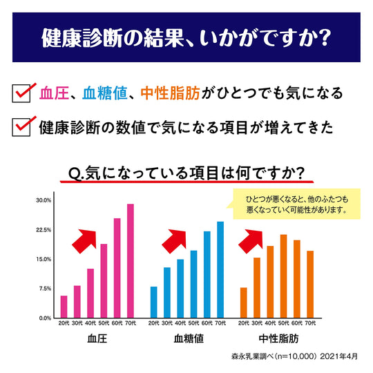 🌈[ ご存じですか? ]< 中性脂肪 ・ 血圧 ・ 血糖値 >どれか1つが悪くなると、他の2つも悪くなっていく可能性があることはご存じですか?何からどう対策したらいいのかお悩みのあなたにこそ『森永トリプルサプリ』がおすすめです! 🌈[ 3つのお悩みをトリプルケア! ]< 中性脂肪 ・ 血圧 ・ 血糖値 >の3つのリスクは関連していると言われているため、同時に対策することが大切です。『森永トリプルサプリ』は1つで< 中性脂肪 ・ 血圧 ・ 血糖値 >の3つにアプローチ!いつもの飲み物に溶かして飲むだけの生活習慣対策 サプリ をお届けします。 🌈[ こだわりの機能性関与成分配合 ]森永乳業が初めて発見した、高めの 血圧 を下げる<カゼインペプチド>。食後の 血糖値 ・ 中性脂肪 の上昇を穏やかにする<難消化性デキストリン>。2つの機能性関与成分が配合された『森永トリプルサプリ』は3つの機能で生活習慣をサポートします。 🌈[...Giá thông thường Từ 0Giá thông thường Từ 0 -