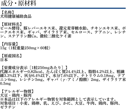 Product description ✅不安やイライラを沈めて、ゆったり気分を維持したいワンちゃんに ✅落ち着きがない、急に吠え出すなど、ワンちゃんの行動で気になることはありませんか?もしかすると、ワンちゃんの不安からくる行動かもしれません。 ✅リラックスに効果があるといわれているギャバは犬の神経組織にも存在していますが、年齢とともに減少していくとも言われています。 ✅ゆったり落ち着いた気分を保つ テアニン、レシチン、ザイラリアを配合した『犬用 国産 おだやか』で、わんちゃんの快適な毎日をサポートしてあげましょう。 ✅こんなワンちゃんはストレスを溜めやすいかも!? 普段の何気ない行動がストレスサインになっているかもしれません。日頃から愛犬をよく観察し、ちょっとした変化にも気付いてあげられるように心がけましょう。 ✅1匹で留守番させることが多い ✅引っ越しなど、環境が大きく変化した ✅飼い主さんの後について回り離れない ✅トイレとは違う場所で排泄してしまう ✅年齢とともに減少するギャバとリラックス成分をまとめて ✅植物由来のリラックス成分を配合し、ワンちゃんのストレスフリーな生活をサポートするとともに、脳内のめぐりにもはたらきかけます。 Directions <与え方のポイント> 粒が食べづらそうな場合は、砕いてフードなどに混ぜて与えていただいても問題ございません。 ※本品はすべて人が食べられる素材を用いておりますが、犬用としてご利用ください。 ※お子様が犬に与えるときは、大人がそばについて目を離さないでください。 ※何らかの異常に気付いた場合は給与を中止し、早めに獣医師にご相談ください。 ※妊娠・授乳期、体調不良、薬を服用中または通院中の犬には、かかりつけの獣医師にご相談の上与えてください。 ※ペットおよびお子様の手の届かないところで保管してください。 ※開封後はしっかり開封口を閉め、賞味期限に関わらずなるべく早く与えてください。 ※本品は天然素材を使用しているため、色調に若干差が生じる場合があります。これは色の調整をしていないためであり、成分含有量や品質に問題はありません。また、保管状況により色が変化する場合がありますが、品質に問題はありません。 ●犬以外の動物には与えないでください。 ●人間と犬とでは、必要な栄養素が異なります。人間用サプリメントは犬に与えないでください。 成分・原材料 <与え方> 本品は犬用健康補助食品です。 手にのせるなどして、そのまま与えるかいつものフードに混ぜて与えてください。 生後3カ月未満の幼犬には与えないでください。 過剰に給与することはさけ、1日の目安量を守ってください。 不安やイライラを沈めて、ゆったり気分を維持したいワンちゃんに...Giá thông thường Từ 1,000Giá thông thường Từ 1,000 -