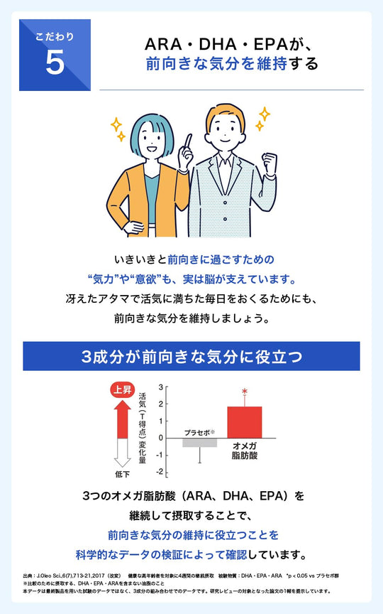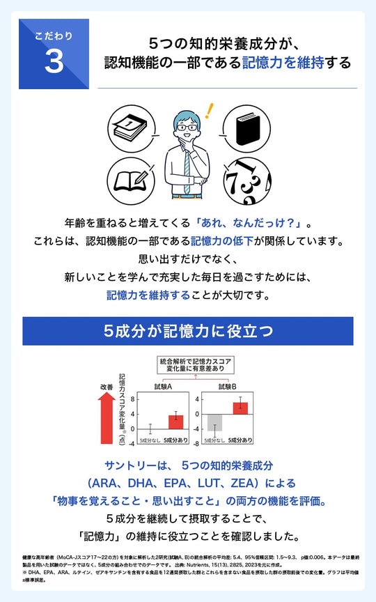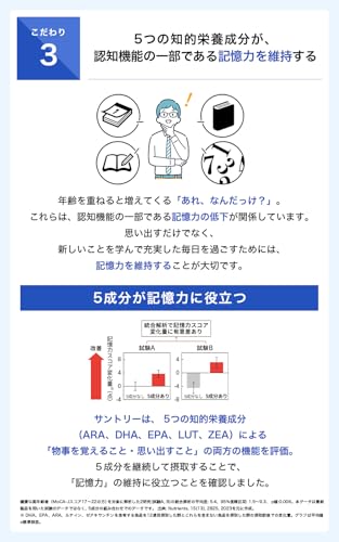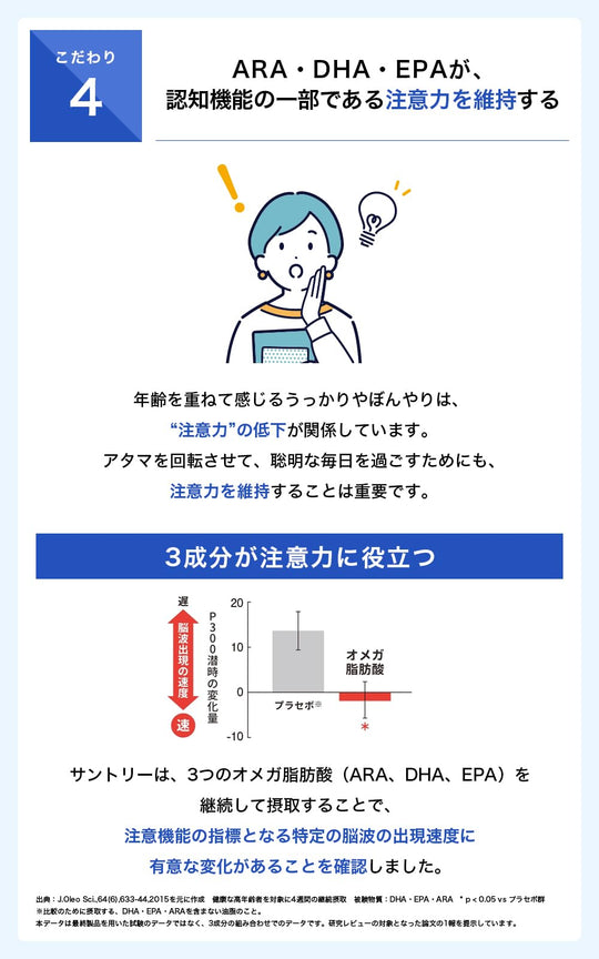 リニューアルに伴い、パッケージ及び原材料が異なる商品がお届けされる場合がございます。 3つのオメガ脂肪酸(DHA・EPA・ARA)と2つの抗酸化成分(ルテイン・ゼアキサンチン)配合のサプリ 新しいことを覚えたり、何かに挑戦したり。仕事への意欲や、趣味に没頭するよろこびも。その原動力は「脳」から生まれています。私たちサントリーは長年研究を重ね、脳に大切な成分ARA(アラキドン酸)、DHA、EPAという3つのオメガ脂肪酸とルテイン、ゼアキサンチンという抗酸化成分の組み合わせにたどり着きました。これら5つの知的栄養成分で構成された『オメガエイド PLUS(プラス)』が、あなたの聡明で前向きな毎日をしっかりとサポートします。 こんな方におすすめです ・新しいことを学び、知識を吸収したい方 ・年齢とともに「あれ?」や「うっかり」が気になる方 ・考える活動をこれからも続けたい方 ・アタマの健康を維持したい方 ・趣味や外出を前向きに楽しみたい方 ・いくつになっても自立した生活を送りたい方 機能性表示食品 ※機能性関与成分による研究報告 届出表示:本品に含まれるDHA、EPA、ARA(アラキドン酸)と抗酸化作用をもつルテイン、ゼアキサンチンは、健康な高年齢者の認知機能の一部である記憶力(覚え思い出す力)を維持することが報告されています。DHA、EPA、ARAは、健康な高年齢者の認知機能の一部である注意力(重要な物事に素早く気づける力、複数の物事に注意を払える力)の維持に役立ち、前向きな気分(頭がさえわたること、活気がわいてくることなど)を維持する機能が報告されています。 › もっと見る ブランド Suntory 風味 アンフレーバー ユニット数 180.00 粒 商品の形状 カプセル 商品の重量 0.08 キログラム 特別な原料 DHA・EPA含有精製魚油(国内製造)、ARA含有食用油脂/ゼラチン、グリセリン脂肪酸エステル、グリセリン、マリーゴールド色素 商品特長 脳の健康サポート 対象年齢 大人 商品の個数 1...Giá thông thường Từ 1,900Giá thông thường Từ 1,900 -