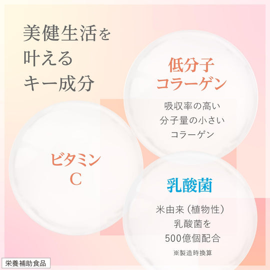 Product Description 美 チョコラ コラーゲンプレミアム 栄養補助食品 基本の美容成分コラーゲン、ビタミンC、B6、B2、B1、ナイアシン、パントテン酸に加え、意識して摂りたい乳酸菌と不足しがちな鉄分も配合。 9種の成分をバランスよく配合したサプリメントが、生活のハリツヤを体の中から支え、毎日のキレイと元気を応援します。 Ingredients 【成分】5粒あたり エネルギー・・・6kcal たんぱく質・・・1.1g 脂質・・・0.04g 炭水化物・・・0.28g 食塩相当量・・・0.036g ビタミンC・・・100mg ビタミンB1・・・1.0mg ビタミンB2・・・2.0mg ビタミンB6・・・10.0mg ナイアシン・・・25mg パントテン酸・・・10.0mg 鉄・・・5.0mg コラーゲンペプチド・・・1000mg 乳酸菌(製造時換算)・・・500億個 アレルギー物質(28品目中) ゼラチン 栄養補助食品 › See more product details Brand チョコラBB Primary Supplement Type...Giá thông thường 2,735Giá thông thường 2,735 -