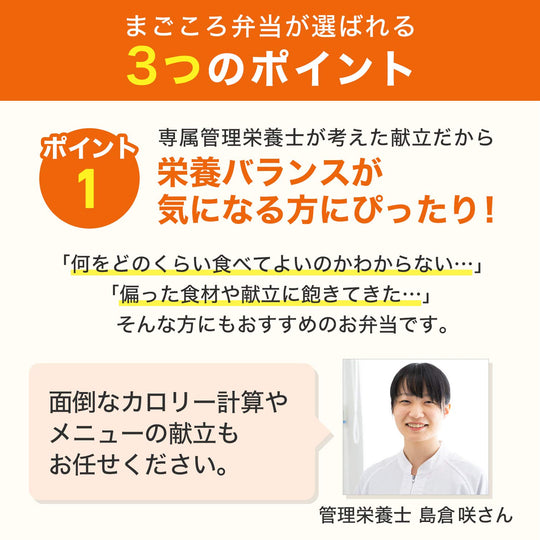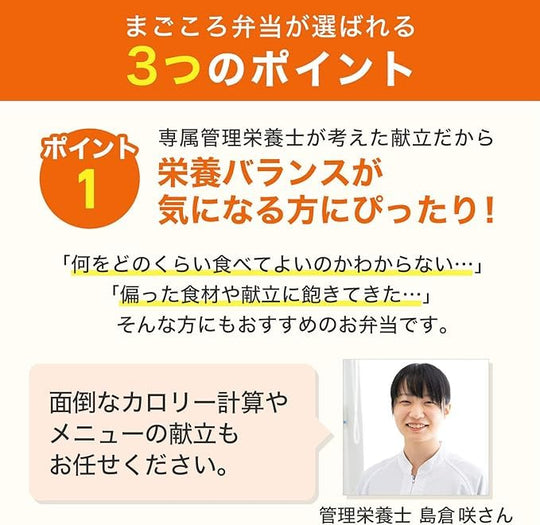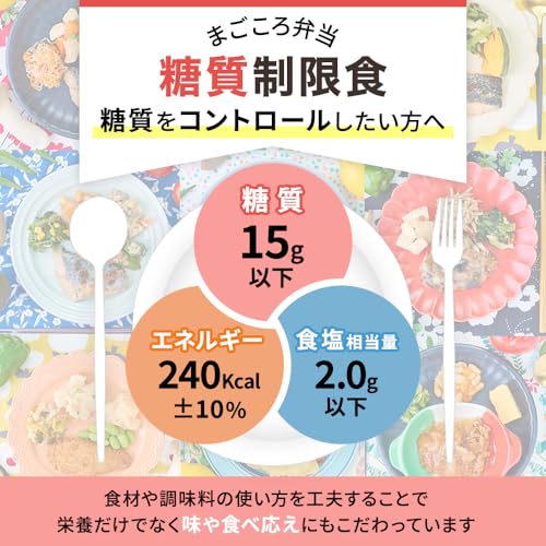 【糖質制限をサポート】1食あたりの糖質を15g以下に抑えた様々な献立で毎日の食生活をサポートします。糖質制限したくても何をどのくらい食べてよいのかわからない、偏った食材やおかずに飽きてきた、糖質控えめのお弁当を探している方におすすめ。まずは、1日1食を「まごころ弁当 糖質制限食」に置き換えをしてみませんか。 【メニューは管理栄養士にお任せ】主菜1品+副菜3品のバランスの取れた管理栄養士監修の宅配弁当です。成分値を守るだけではなく、彩りも見た目のバランスも良く、満足してお召し上がりいただける宅配食です。面倒なカロリー計算や糖質少なめメニューの献立もお任せください。 【レンジで簡単 冷凍弁当】1食分ごとに電子レンジで温めるだけで簡単にお召し上がり頂けます。「600Wで約3分、500Wで約3分30秒」で温めてください。詳細は届いた際のパッケージをご確認ください。 【組み合わせ色々・豊富なメニュー】魚料理や肉料理、また和・洋・中の様々な献立を、全て違う主菜でお届けいたします。食べやすく飽きのこない制限食を目指し、たくさんのメニューをご用意しています。食材や調味料の使い方も工夫し、ボリュームにもこだわりました。 【まごころケア食は常備食としても活躍】クール宅急便でお届け。賞味期限はお届け後、冷凍で6ヶ月以上の長期冷凍保存が可能です。食事を作れない時の常備食としても活躍するので安心・便利。 › もっと見る ブランド まごころ弁当 パッケージ情報 ケース 商品の個数 21 商品の重量 4.8 キログラム 商品の形状 冷凍Giá thông thường Từ 7,800Giá thông thường Từ 7,800