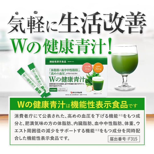 新日本製薬 株式会社が販売する商品において紅麹原料は一切、使用しておりませんことをご報告いたします。 当社では、全ての商品の品質、安全性について厳しく管理しております。今後もお客さまに安心してご利用いただける商品の提供に努めて参ります。 『Wの健康青汁』は、野菜の栄養を摂れる青汁に、肥満気味の方の血中中性脂肪の減少をサポートする「エラグ酸」と、高めの血圧を下げる機能をもつ「GABA」を配合した機能性表示食品です。大麦若葉、明日葉、桑の葉などを配合し、すっきりと飲みやすいだけでなく、明確な意図を持って飲むことで、毎日続けられるようにと開発されました。毎日の健康習慣におすすめの青汁です。 機能性表示食品:届出番号 F315 【届出表示】本品にはエラグ酸とGABAが含まれます。エラグ酸は肥満気味の方の体脂肪や内臓脂肪、血中中性脂肪、体重、ウエスト周囲径の減少をサポートし、高めのBMI値の改善を助ける機能が、GABAは血圧が高めの方の血圧を下げる機能があることが報告されています。 エラグ酸とはポリフェノールの一種で、ザクロやイチゴなどに含まれている成分です。本商品のエラグ酸はアフリカマンゴノキという植物の種子から得ております。アフリカマンゴノキの果実や種子はアフリカなどで古くから食用とされてきました。エラグ酸は、肥満気味の方の体脂肪、内臓脂肪、血中中性脂肪、体重、ウエスト周囲径の減少をサポートし、高めのBMI値の改善を助ける機能があることが報告されています。 GABAは、植物や動物、私たち人間の体内にも存在し、体の中での情報を伝達する物質として働いています。また、血圧が高めの方の血圧を下げる機能があることが報告されています。 ビタミンやミネラルなどの栄養素が豊富な「大麦若葉」や「明日葉」「桑の葉」「玉葱エキス」の国産素材を使用しております。また、乳酸菌とビフィズス菌を配合し、毎日の健康維持をサポートします。 約100mlの水や、その他のお飲み物(牛乳など)に溶かしてお召し上がりください。ヨーグルトなどの食べ物に混ぜていただくのもおすすめです。冷たいお飲み物が苦手な場合は、温かいお湯や飲み物にまぜていただいても結構です。ただし、高温で長時間調理するような場合(ホットケーキやクッキーにまぜて焼くなど)は、成分が減少する可能性がございますので、おすすめできません。 ※本品は、事業者の責任において特定の保険の⽬的が期待できる旨を表⽰するものとして、消費者庁⻑官に届け出されたものです。ただし、特定保健⽤⾷品と異なり、消費者庁⻑官による個別審査を受けた物ではありません。※本品は、疾病の診断、治療、予防を⽬的としたものではありません。※本品は、疾病に罹患している者、未成年者、妊産婦(妊娠を計画している者を含む。)及び授乳婦を対象に開発された⾷品ではありません。※疾病に罹患している場合は医師に、医薬品を服⽤している場合は医師、薬剤師に相談してください。※体調に異変を感じた際は、速やかに摂取を中⽌し、医師に相談してください。※降圧剤を服⽤中の⽅は医師にご相談ください。※妊娠中・授乳中の⽅は、医師にご相談いただくか、ご使⽤をお控えください。◎⾷⽣活は、主⾷、主菜、副菜を基本に、⾷事のバランスを。 › もっと見る ブランド 新日本製薬 商品の形状 粉末 メーカー 新日本製薬 商品パッケージ数 1 パッケージ情報 ボックスGiá thông thường Từ 4,500Giá thông thường Từ 4,500 -