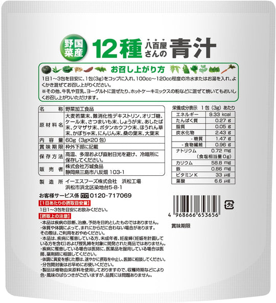 商品紹介 主に八百屋さんで販売している12種の国産野菜を使用してすっきり飲みやすいおいしい青汁に仕上げました。 1日1~3包を目安に1包をコップに入れ、100CC~120CC程度の冷水またはお湯を入れ、よくかき混ぜてお召し上がりください。 その他、牛乳や豆乳、ヨーグルトに混ぜてもおいしくお召し上がりいただけます。 使用方法 1包をコップに入れ100CC~120CC程度の冷水またはお湯でよくかき混ぜる。 原材料:大麦若葉末、難消化性デキストリン、オリゴ糖、ケール末、さつまいも末、しょうが末、あしたば末、クマザサ末、ボタンボウフウ末、ほうれん草末、かぼちゃ末、にんじん末、桑の葉末、大葉末 内容量:20包 カロリー:9.33kcal/3gあたり 商品サイズ(高さx奥行x幅):45mm×18mm×200mm › もっと見るGiá thông thường 665Giá thông thường 665 -