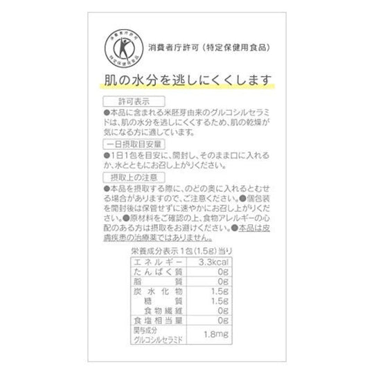 商品紹介 日本初販売・ 肌に機能のあるトクホ! 肌の水分を逃しにくくする“飲むスキンケア"。発売までに10年を費やした、肌のための特定保健用食品です。米胚芽から抽出した「グルコシルセラミド」配合。「肌の水分を逃しにくくするため、肌の乾燥が気になる方に適している」とトクホとして許可された、“飲むスキンケア"食品です。「グルコシルセラミド」を毎日飲むことによって肌の水分蒸発量が徐々に減り、3ヵ月後には有意差を表すデータが出ています。肌の最外壁を強化し、肌表面・肌の奥の細胞のすき間を埋める3段階バリアで、肌にうるおいを留めます。“飲むスキンケア"だから、顔はもちろん、背中や足など、スキンケア効果は全身に現れます。 水なしで飲めるゆず風味のさわやかなパウダーだから、いつでもどこでもおいしくスキンケアできます。 ■30日分(1.5g×30包) 原産国:日本 【お召し上がり方】1日1包を目安に、開封し、そのまま口に入れるか、水とともにお召し上がりください。 ※食生活は、主食、主菜、副菜を基本に、食事のバランスを。 ※関与成分:米胚芽由来グルコシルセラミド1.8mg(1包当り) 原材料・成分 【原材料】還元麦芽糖水飴(国内製造)、ユズ粉末果汁、米胚芽抽出物/シクロデキストリン、酸味料、香料【成分】エネルギー:3.3kcal、たんぱく質:0g、脂質:0g、炭水化物:1.5g(糖質:1.5g、食物繊維:0g)、食塩相当量:0g、(関与成分)グルコシルセラミド:1.8mg オルビス株式会社の正規品(新品・未開封)は販売者Amazonのみで販売しております。 特定保健用食品(トクホ) 許可表示:本品に含まれる米胚芽由来のグルコシルセラミドは、肌の水分を逃しにくくするため、肌の乾燥が気になる方に適しています。 一日摂取目安量:1日1包を目安に、開封し、そのまま口にいれるか、水とともにお召し上がりください。 原産国 :日本 内容量:45g(1.5g× 30包) › もっと見る ブランド オルビス(ORBIS) 風味 1.ゆず風味 プライマリサプリメントタイプ ビタミンB2 ユニット数 30 本 商品の形状 粉末 商品の重量 45 グラム...Giá thông thường Từ 2,200Giá thông thường Từ 2,200 -