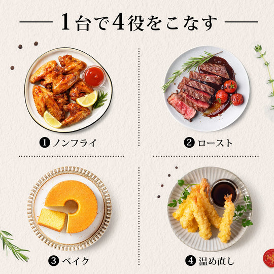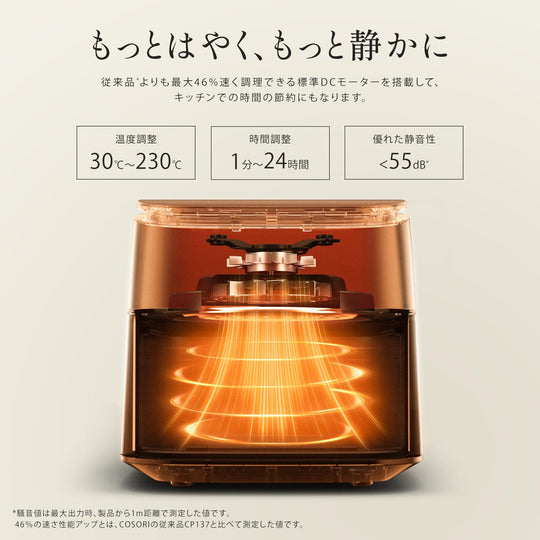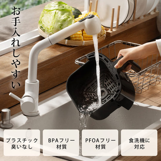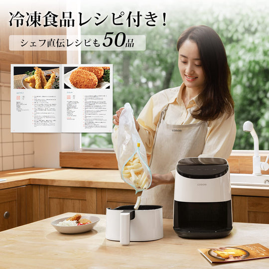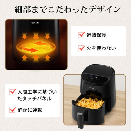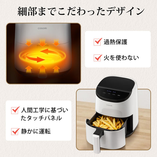 【DCモーター搭載】エネルギー効率が高く、静音性に優れたDCモーター搭載。従来品よりも最大38%速く調理できる、貴重な時間を節約できます。COSORIの独自技術により、最高230℃までの温度設定が可能になります。熱風で迅速に調理し、食材の水分と旨みをとじ込みながら、均一に加熱して内部をふんわり柔らかく、外側をパリッと焼き上げます。暑い日に揚げ物を作るストレスも解消! 【95%オイルカット・6L大容量】少量の油で健康的な調理を実現し、しかもカロパが良くて、まるでお店の唐揚げのようなサクサクした食感でおいしい。6Lの大容量で大人数向けの料理を一度に調理でき、パーティーなどのイベントにも対応できます。コンパクトで収納しやすく、キッチンに置いてもインテリアとして映えます。 【発酵機能】バター、ヨーグルト・味噌、酢・・・美容と健康に良い発酵食品を作ることができます。発酵食品で腸内環境をサポートしながら、日々輝く自分へ。 【9+1の多彩な機能】揚げ物から焼き物、ドライフード、ベイク、ロースト、グリル、保温、解凍、再加熱、発酵までさまざまな料理が可能。様々な料理を簡単に調理でき、コスパも抜群です。はじめてのかたでも簡単に使えるシンプルな操作で、ストレスフリーな調理を実現します。夫婦で一緒に、そして子どもと一緒に楽しみながら料理する、しかもペットフードを手作りできます! 【料理研究家コラボレシピ特典】Nadiaで活躍する料理研究家今日のおうちごはんさん、中村りえさん、豪ノ皿さんとの共同レシピやCOSORIの専門シェフが開発されたオリジナルレシピなどの特典レシピ本が付属しています。さらに、COSORI専属オンラインレシピでダイエットにうれしいレシピ、家族が喜ぶおいしいご飯のレシピなど100種類以上のレシピをオンラインでチェックできます。 › もっと見る 特徴 容量6L、温度設定範囲30~230°C、時間設定範囲1分~24時間 、寸法(ハンドルを含む)40cm × 30cm × 30.1 cm、重量5.2kg、電源AC100V、定格電力1,500W 商品の寸法 40奥行き x 30幅 x 30.1高さ cm 色 ブラック 容量 6 L 材質 アクリロニトリルブタジエンスチレン (ABS)Giá thông thường Từ 20,600Giá thông thường Từ 20,600 -