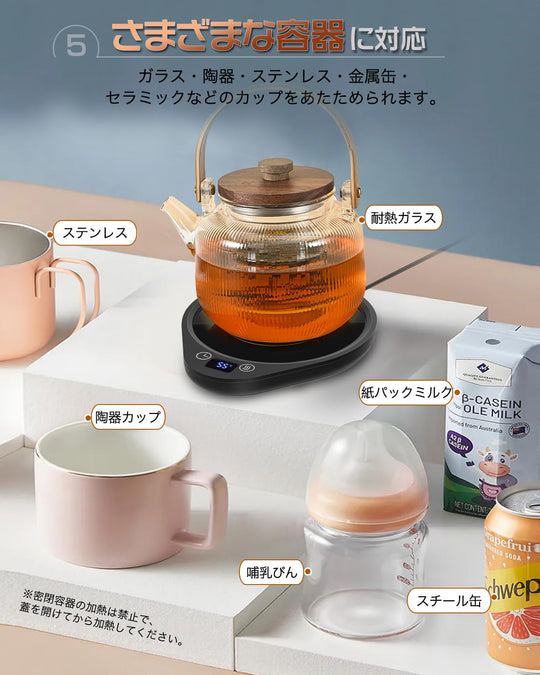 ☕【飲みたい時にいつでも温かい】寒さが厳しい季節に、体を温めたり、ほっとひと息つくのにかかせないホットドリンク。この時期は仕事や勉強を行う際に、ホットコーヒーや紅茶などを淹れる人も多いでしょう。ですが、仕事や勉強に集中してうっかり放置してしまい、気付いたらすっかり冷めていた…という経験をした人も多いのではないでしょうか。そんなときにおすすめなのがAMZHOOZの「カップウォーマー」です。マグカップなどに入れた飲み物を長時間保温できます。冬などの寒い季節には欠かせないアイテムです! ☕【3段階の温度設定&急速加熱】55℃、65℃、80℃の3段階の温度設定が可能なため、コーヒーやお茶、牛乳などを好みに合わせて調節できます。設定した温度をずっと保つので、いつでも温かい飲み物が飲めます!また、AMZHOOZのカップ保温器はコンセント給電タイプで、出力が大きく、保温温度が高いのが特徴です。あたたかい飲み物をそのままキープするだけでなく、冷めてしまった飲み物をあたためることも可能です。 ☕【便利な切タイマー&過熱防止機能】加熱中にタイマーボタンで2、4、6、8、10、12時間を選択し、オフ時間を自由に設定できます。また、温度センサーを搭載しており、スイッチを入れてから4時間経過すると、自動で電源をオフにするので消し忘れを防げて安心です。 ☕【耐熱ガラスセラミックパネル】防爆性と耐熱性に優れた、ガラスセラミックパネルを採用しています。カップウォーマーの表面に液体がはねても安心、お手入れもしやすいです。また、約1.5mの長めの電源コードで、コンセントから離れていても使用しやすいです。 ☕【さまざまな容器に対応】さまざまなカップに対応している、使い勝手のよいカップウォーマーです。ガラス・陶器・ステンレス・金属缶・セラミックなどのカップをあたためられます。ドリンクを陶器のマグカップに移さなくても使えるためとても便利です。また、デザインもシンプルなので、自宅だけでなくオフィスで使うのもおすすめです。 › もっと見る 色 01木目 材質 ガラスセラミック ブランド AMZHOOZ 商品の寸法 17.6長さ x 15幅 cm メーカー AMZHOOZGiá thông thường Từ 0Giá thông thường Từ 0 -