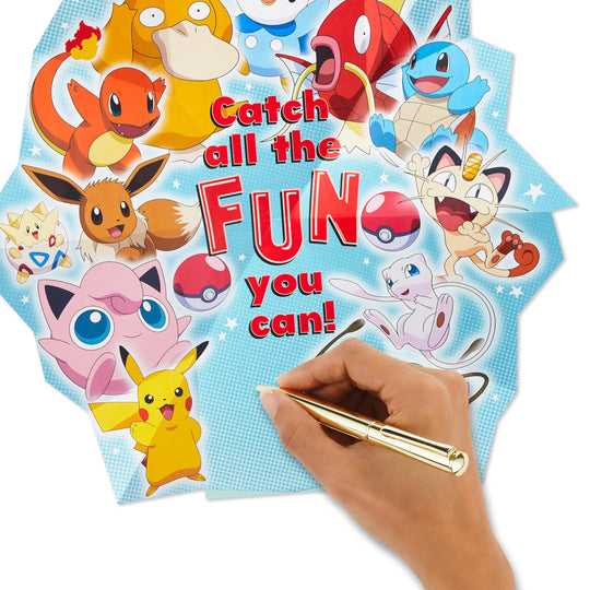 この陽気なバースデーカードで、お子様やポケモンファンを同じように祝いましょう。 愛するキャラクターのポップアウトデザインが特徴のこの楽しいカードは、あらゆる年齢の子供、孫、姪、甥、クラスメート、ポケモンファンに最適です。 Hallmarkブランドは、グリーティングカード、ギフトラップなどに最適な商品として広く知られています。 Hallmarkは100年以上にわたり、お客様が毎日の瞬間をより美しく、お祝いをより楽しくするお手伝いをしてきました。 この楽しいポップアップバースデーカードで、お子様やポケモンファンを喜ばせましょう。 カードの前面には、ピカチュウ、ゼガメ、ヒトカゲ、フシギダウルスが描かれています。「It's your Birthday!」と書かれています。 カードの内側にはジググリパフ、ミュウ、マジカープ、ニャースなどが現れ、「Catch the fun you can!」と書かれたテキストが付いています。 子供用バースデーカードのサイズは5.8インチ x 8.3インチで、お揃いの封筒が付属します。 高品質の紙素材から作られ、Hallmarkのグリーティングカードは、管理の行き届いた森林の紙で作られています。 › もっと見るGiá thông thường Từ 18Giá thông thường Từ 18 -