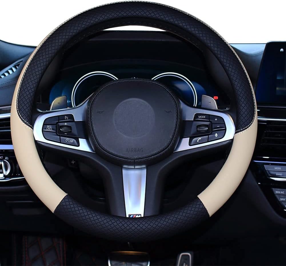 HUACHENG ハンドルカバー 車用 軽自動車 sサイズ ステアリングカバー 本革 汎用 おしゃれ 通気性がよい 滑り防止 オールシーズン対応 普通車 ハンドル 保護カバー カスタム 内装パーツ アクセサリー 車用品 (ベージュ)