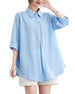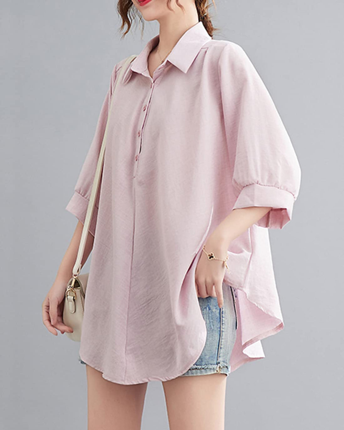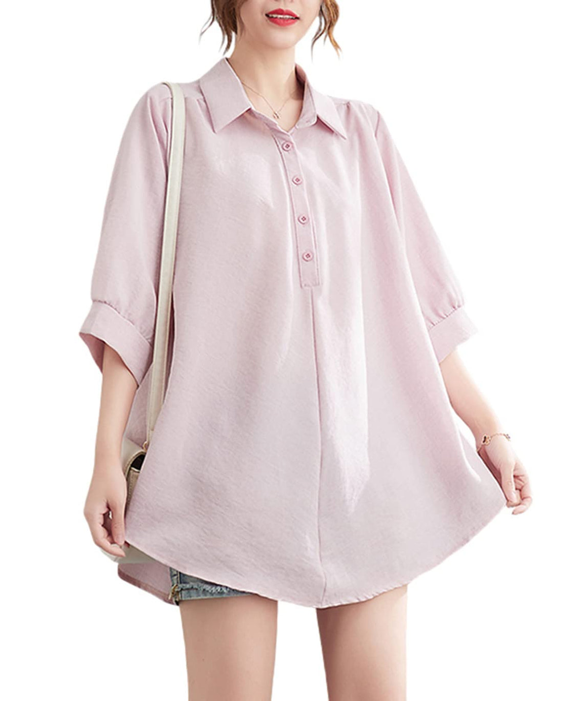 - 衿はボタン留めデザインで、ボタンを開けてはⅴネックになる、顔近くに視線を集めてくれて、エレガントな女性スタイルを完成されるレディース無地シャツです。