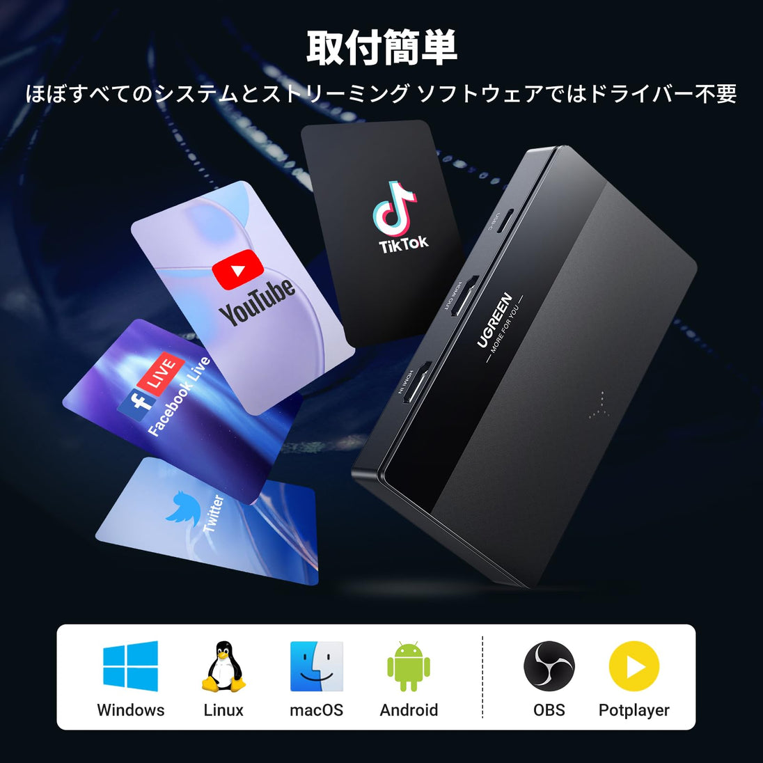- 【幅広い互換性】このUGREEN Mac キャプチャーボードは、Windows/Mac両対応で、Mac OS、Windows 8.1/10、Linux、Androidのみならず、最新バーションiOS/iPad OS17と互換性があります。既存のソフトウェアに組み込まれている機能を活用し、OBS、Tik Tok、YouTube、Twitter、Facebook Live、XSplit、Potplayer、QuickTime Playerで利用可能、シームレスなエクスペリエンスを得ることができます。録画、編集、ビデオのストリーミングに最適です。(★ご注意:信号ソースが HDCPによりコンテンツが暗号化された場合は、本製品はキャプチャと録画をサポートしません。)